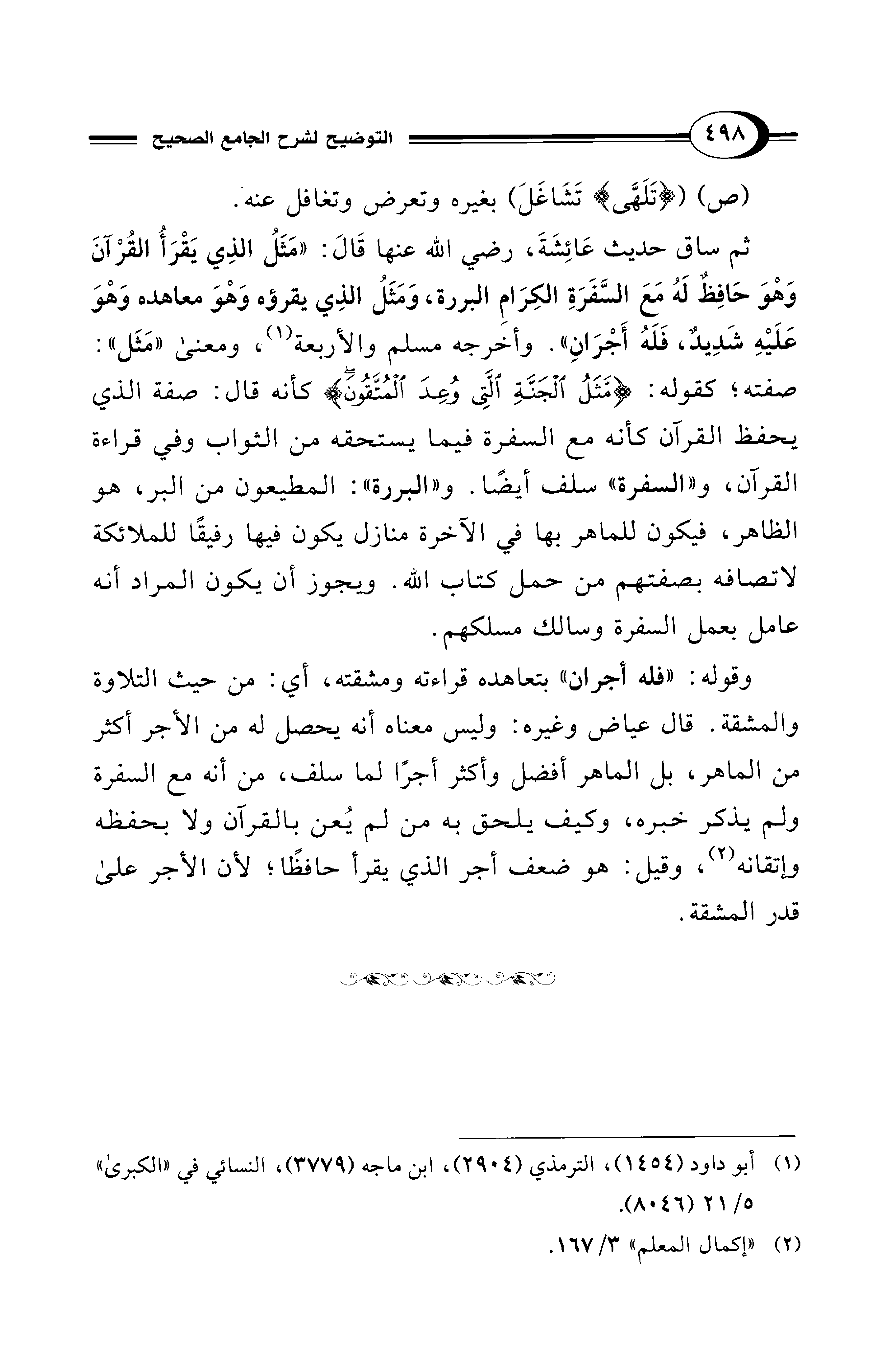 ثم ساق حديث عَائِشَةَ، رضي الله عنها قَالَ: "مَثَلُ الذِي يَقْرَأُ القُرْآنَ وَهْوَ حَافِظٌ لَهُ مَعَ السَّفَرَةِ الكِرَامِ البررة، وَمَثَلُ الذِي يقرؤه وَهْوَ معاهده وَهْوَ عَلَيْهِ شَدِيدٌ، فَلَهُ أَجْرَانِ". وأخرجه مسلم والأربعة (¬1)، ومعنى "مَثَل": صفته؛ كقوله: {مَثَلُ الْجَنَّةِ الَّتِي وُعِدَ الْمُتَّقُونَ} كأنه قال: صفة الذي يحفظ القرآن كأنه مع السفرة فيما يستحقه من الثواب وفي قراءة القرآن، و"السفرة" سلف أيضًا. و"البررة": المطيعون من البر، هو الظاهر، فيكون للماهر بها في الآخرة منازل يكون فيها رفيقًا للملائكة لاتصافه بصفتهم من حمل كتاب الله. ويجوز أن يكون المراد أنه عامل بعمل السفرة وسالك مسلكهم.