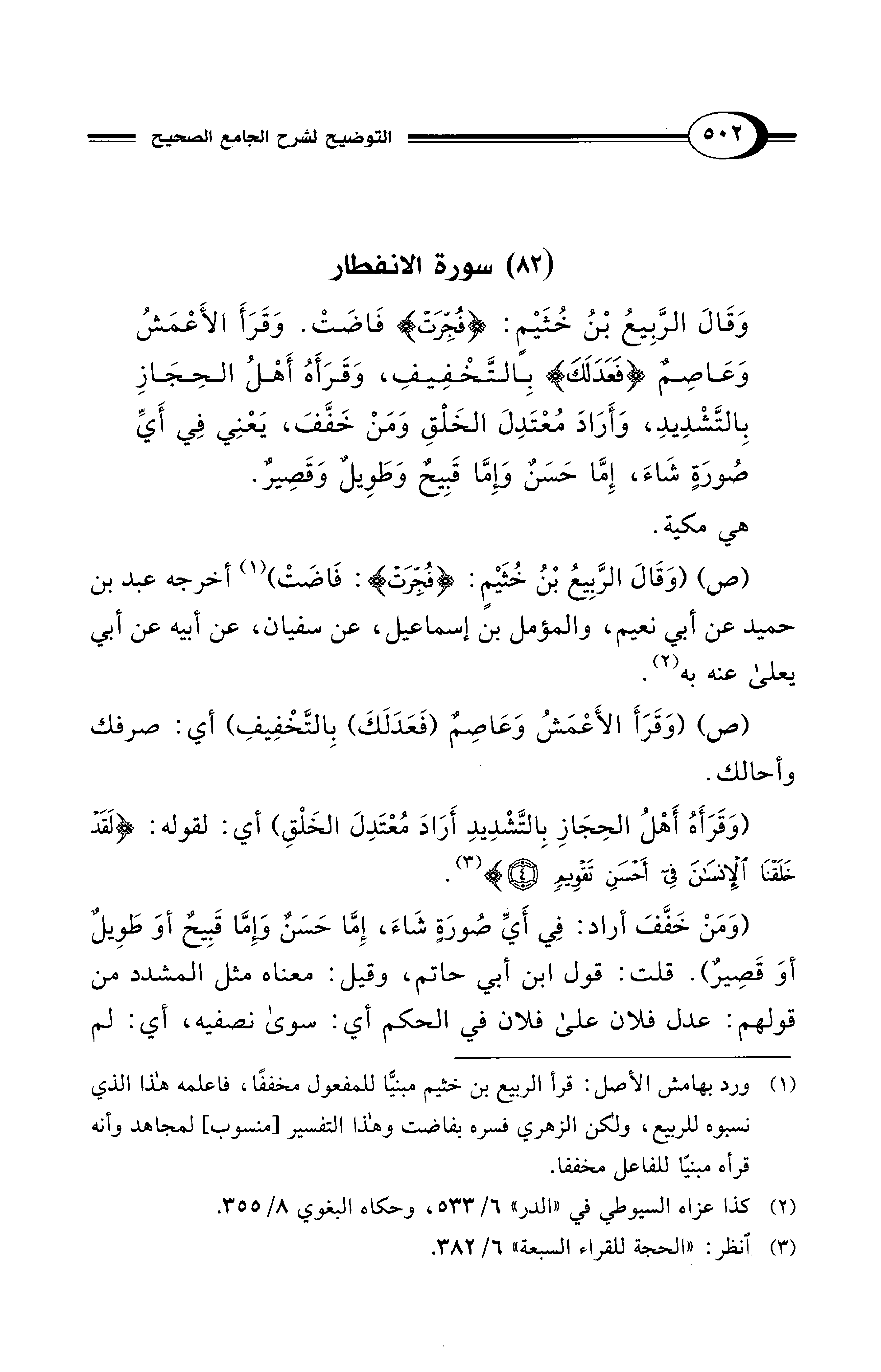 وَقَالَ الرَّبِيعُ بْنُ خُثَيْمٍ: {فُجِّرَتْ} فَاضَتْ. وَقَرَأَ الأَعْمَشُ وَعَاصِمٌ {فَعَدَلَكَ} بِالتَّخْفِيفِ، وَقَرَأَهُ أَهْلُ الحِجَازِ بِالتَّشْدِيدِ، وَأَرَادَ مُعْتَدِلَ الخَلْقِ وَمَنْ خَفَّفَ، يَعْنِي فِي أَيِّ صُورَةٍ شَاءَ، إِمَّا حَسَنٌ وَإِمَّا قَبِيحٌ وَطَوِيلٌ وَقَصِيرٌ.