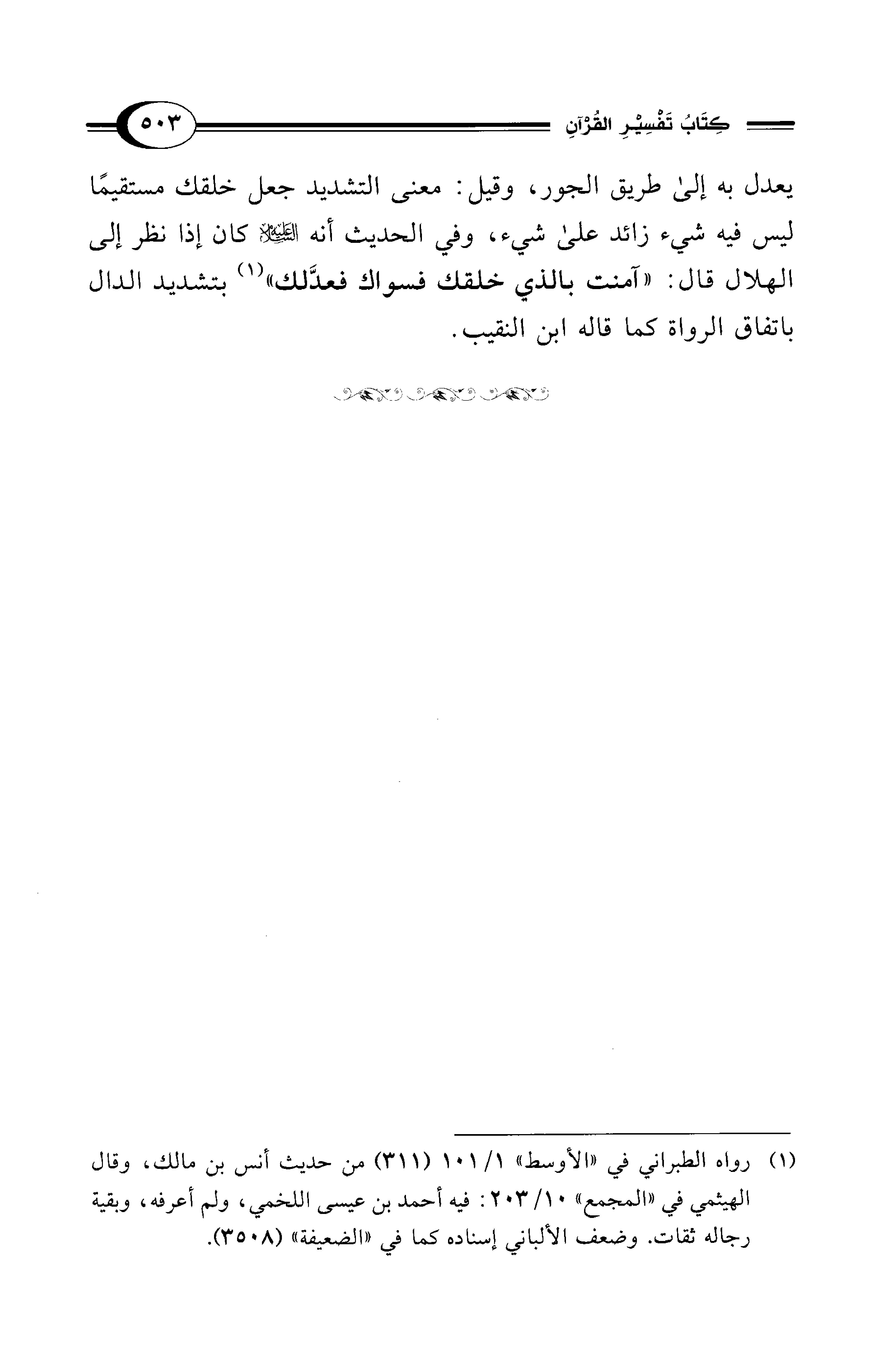 يعدل به إلى طريق الجور، وقيل: معنى التشديد جعل خلقك مستقيمًا ليس فيه شيء زائد على شيء، وفي الحديث أنه - عليه السلام - كان إذا نظر إلى الهلال قال: "آمنت بالذي خلقك فسواك فعدَّلك" (¬1) بتشديد الدال باتفاق الرواة كما قاله ابن النقيب.