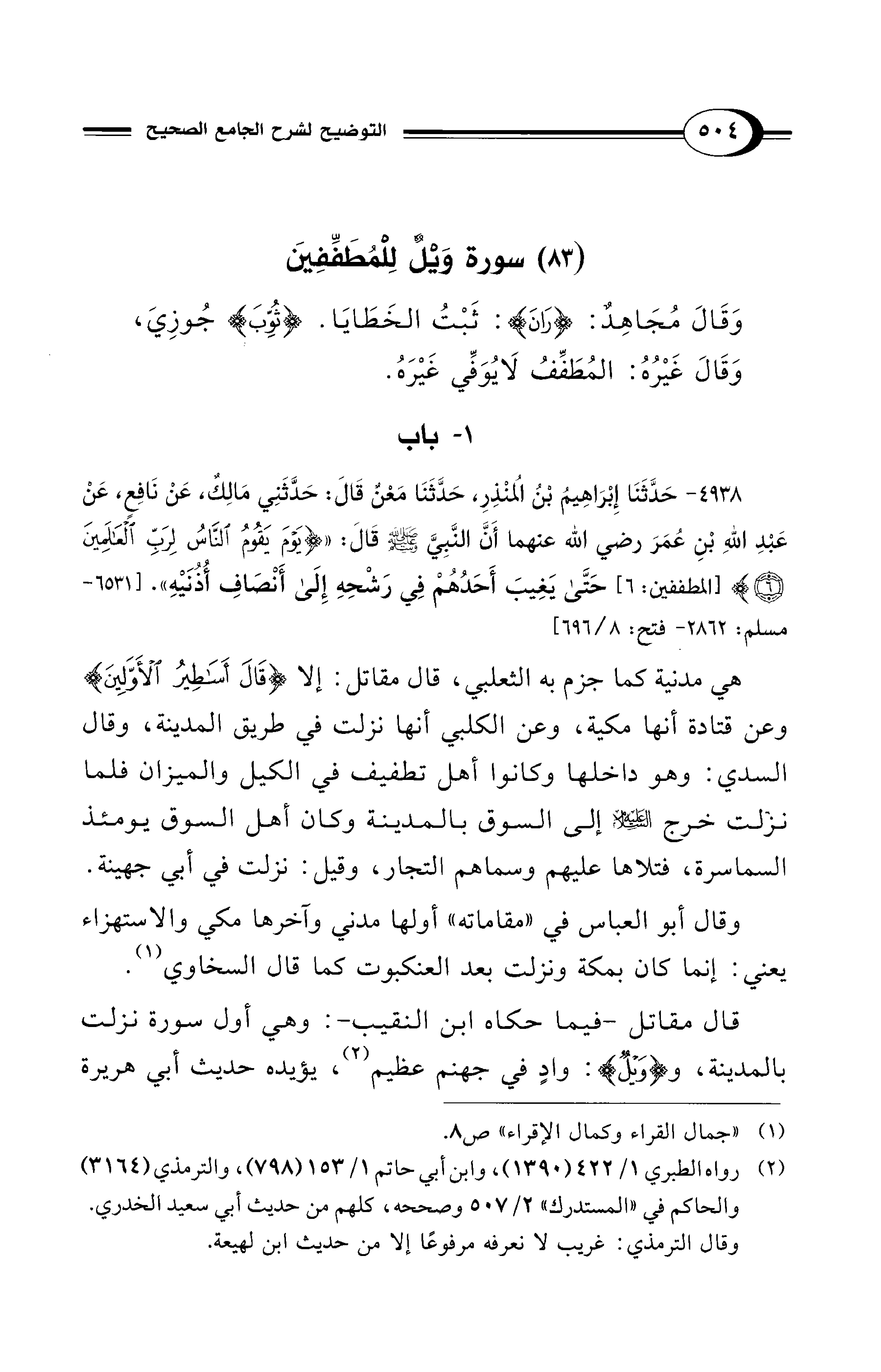 قال مقاتل -فيما حكاه ابن النقيب-: وهي أول سورة نزلت بالمدينة، و {وَيْلٌ}: وادٍ في جهنم عظيم (¬2)، يؤيده حديث أبي هريرة