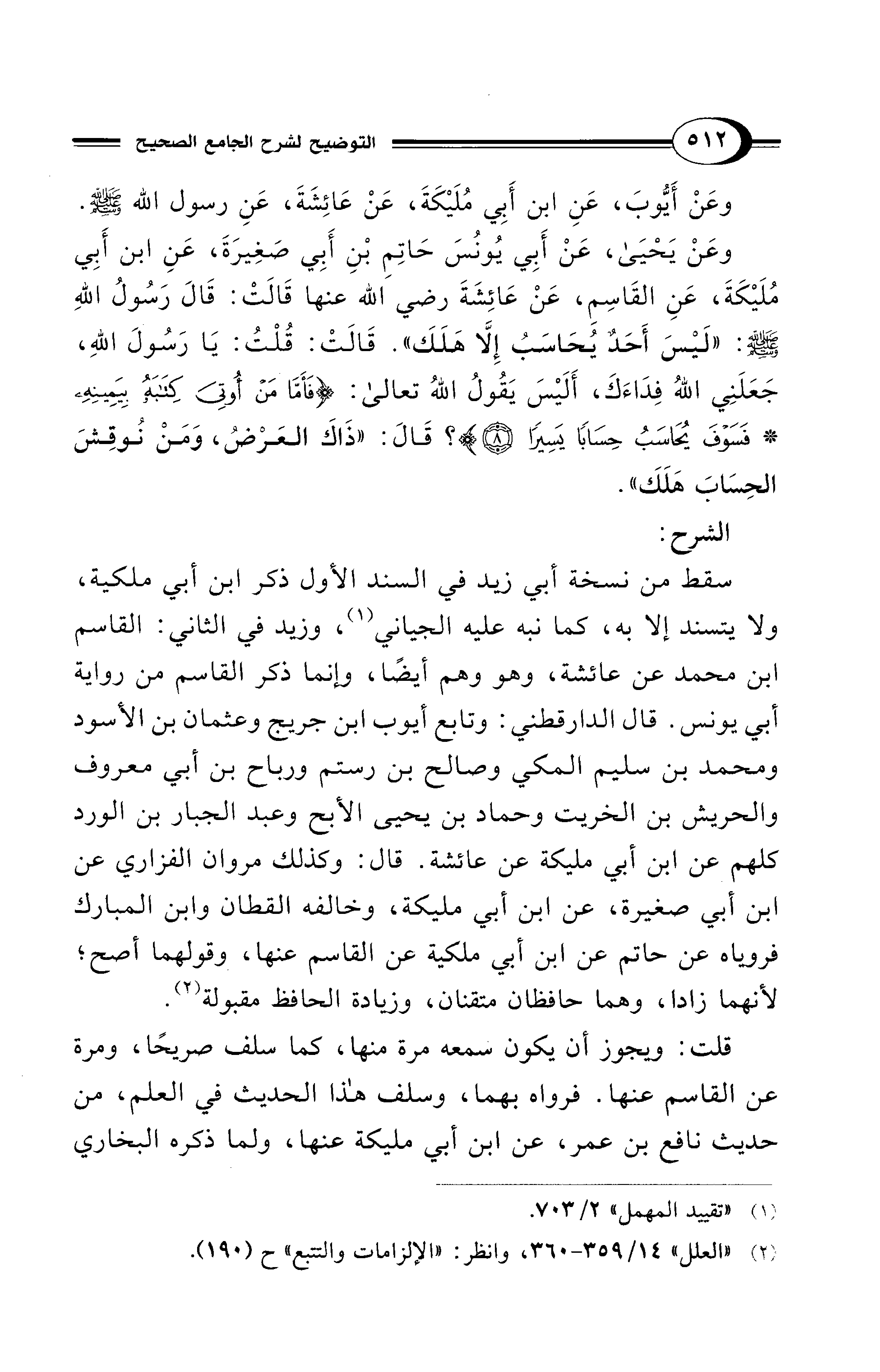 وعَنْ يَحْيَى، عَنْ أَبِي يُونُسَ حَاتِمِ بْنِ أَبِي صَغِيرَةَ، عَنِ ابن أَبِي مُلَيْكَةَ، عَنِ القَاسِمِ، عَنْ عَائِشَةَ رضي الله عنها قَالَتْ: قَالَ رَسُولُ اللهِ - صلى الله عليه وسلم -: "لَيْسَ أَحَدٌ يُحَاسَبُ إِلَّا هَلَكَ". قَالَتْ: قُلْتُ: يَا رَسُولَ اللهِ، جَعَلَنِي اللهُ فِدَاءَكَ، أَلَيْسَ يَقُولُ اللهُ تعالى: {فَأَمَّا مَنْ أُوتِيَ كِتَابَهُ بِيَمِينِهِ (7) فَسَوْفَ يُحَاسَبُ حِسَابًا يَسِيرًا (8)}؟ قَالَ: "ذَاكَ العَرْضُ، وَمَنْ نُوقِشَ الحِسَابَ هَلَكَ".