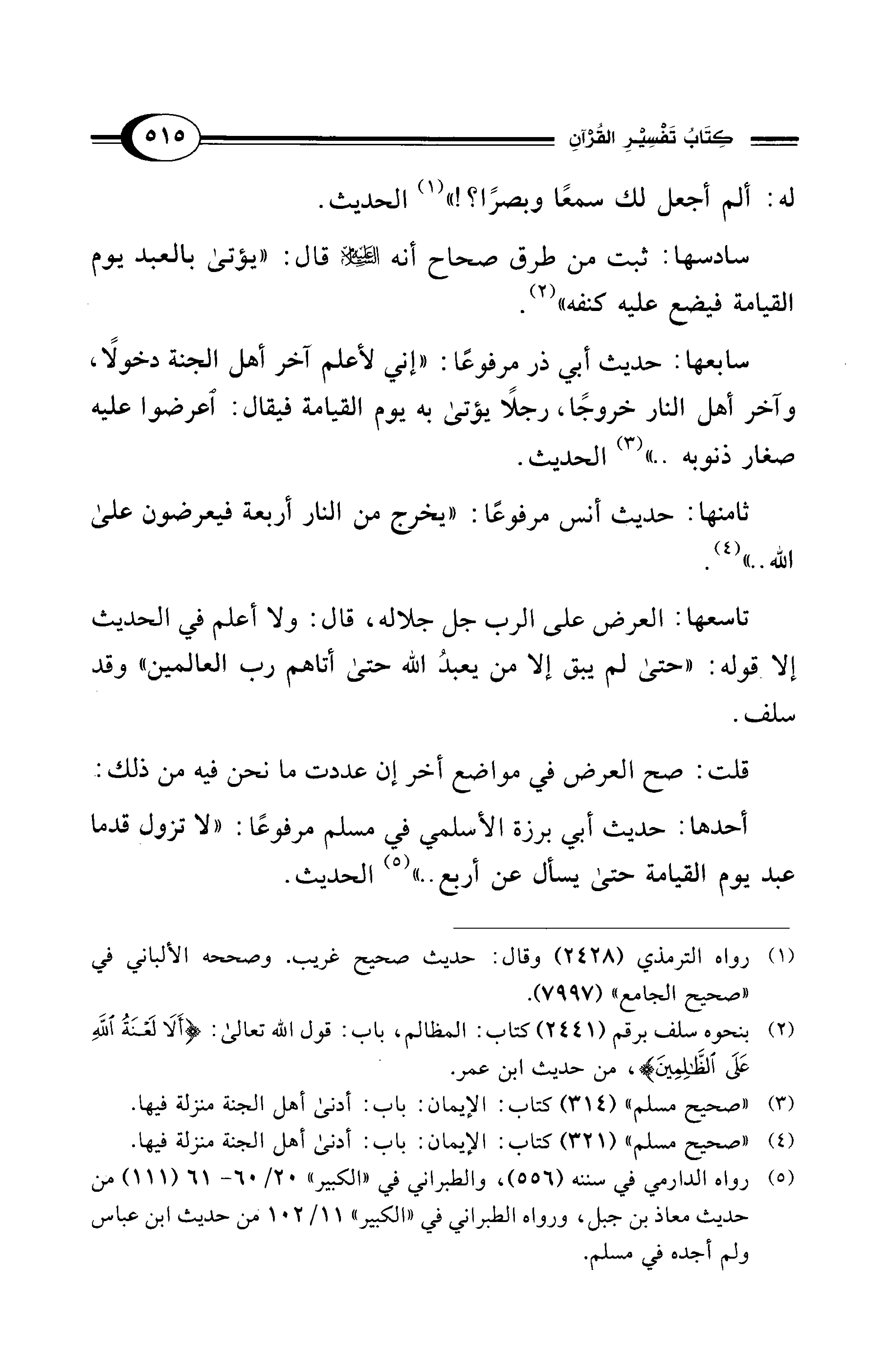 أحدها: حديث أبي برزة الأسلمي في مسلم مرفوعًا: "لا تزول قدما عبد يوم القيامة حتى يسأل عن أربع .. " (¬5) الحديث.