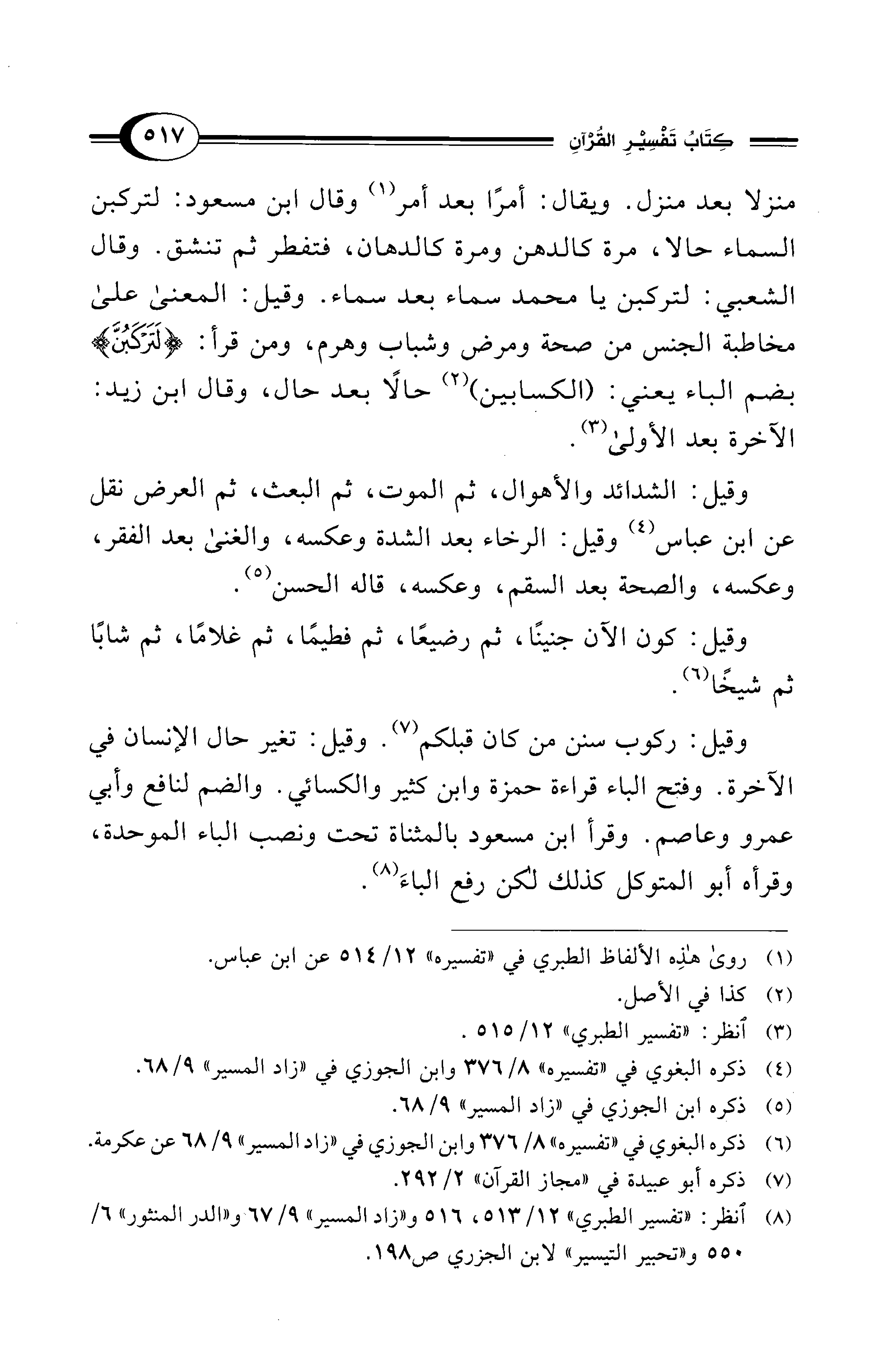 منزلا بعد منزل. ويقال: أمرًا بعد أمر (¬1) وقال ابن مسعود: لتركبن السماء حالا، مرة كالدهن ومرة كالدهان، فتفطر ثم تنشق. وقال الشعبي: لتركبن يا محمد سماء بعد سماء. وقيل: المعنى على مخاطبة الجنس من صحة ومرض وشباب وهرم، ومن قرأ: {لَتَرْكَبُنَّ} بضم الباء يعني: (الكسابين) (¬2) حالًا بعد حال، وقال ابن زيد: الآخرة بعد الأولى (¬3).