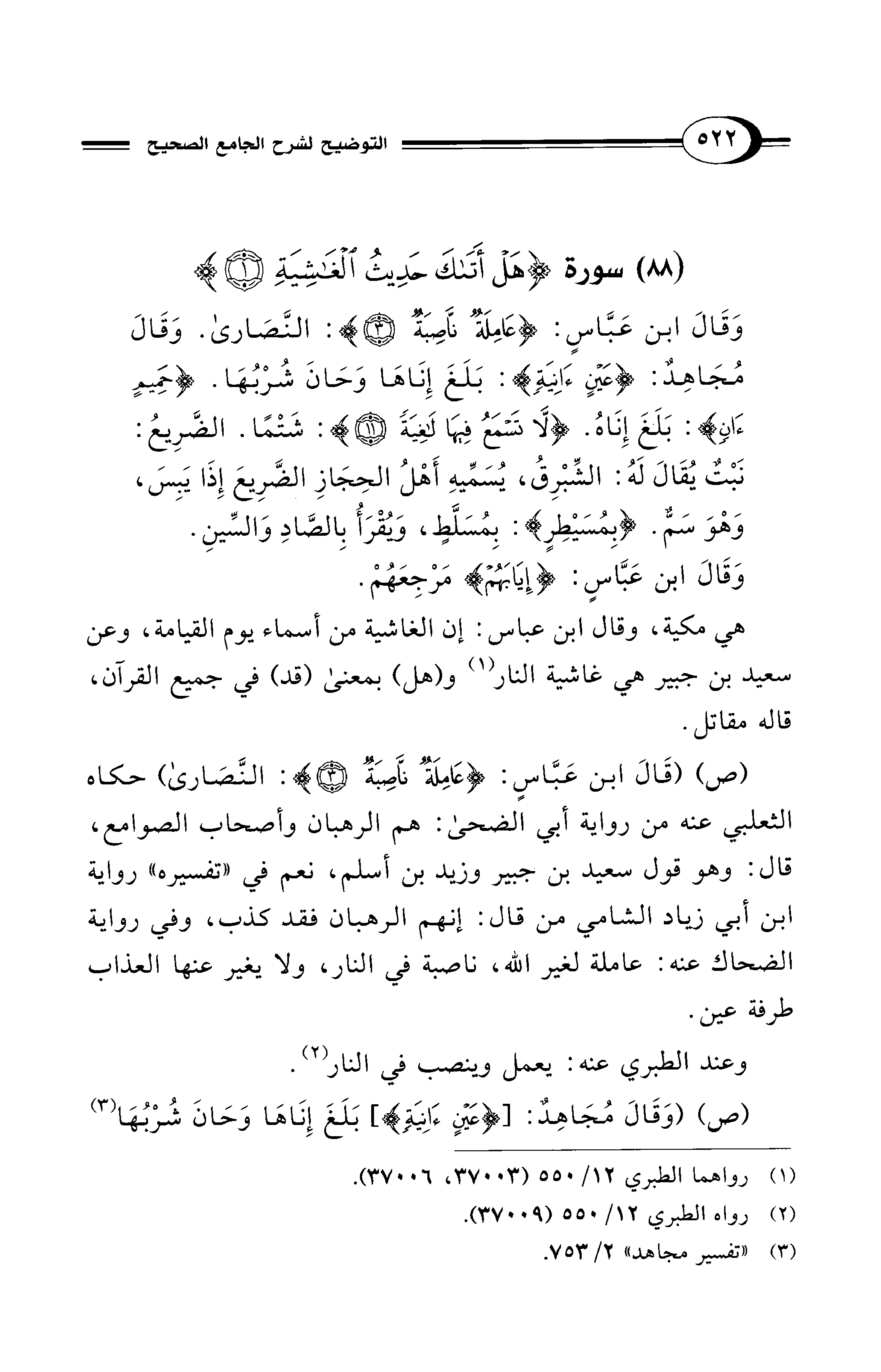 (ص) (قَالَ ابن عَبَّاسٍ: {عَامِلَةٌ نَاصِبَةٌ (3)}: النَّصَارى) حكاه الثعلبي عنه من رواية أبي الضحى: هم الرهبان وأصحاب الصوامع، قال: وهو قول سعيد بن جبير وزيد بن أسلم، نعم في "تفسيره" رواية ابن أبي زياد الشامي من قال: إنهم الرهبان فقد كذب، وفي رواية الضحاك عنه: عاملة لغير الله، ناصبة في النار، ولا يغير عنها العذاب طرفة عين.