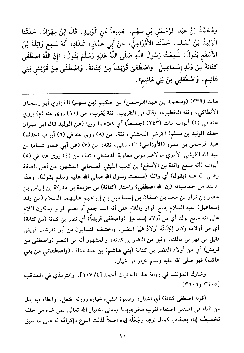 وَمُحَمَّدُ بْنُ عَبْدِ الرَّحْمَنِ بْنِ سَهْمٍ، جَمِيعًا عَنِ الْوَلِيدِ. قَال ابْنُ مِهْرَانَ: حَدَّثَنَا الْوَلِيدُ بْنُ مُسْلِمٍ. حَدَّثَنَا الاوْزَاعِيُّ، عَنْ أَبِي عَمَّارٍ، شَدَّادِ؛ أَنَّهُ سَمِعَ وَاثِلَةَ بْنَ الأسقَعِ يَقُولُ: سَمِعْتُ رَسُولَ اللهِ صَلَّى اللهُ عَلَيهِ وَسَلَّمَ يَقُولُ: "إِن اللهَ اصْطَفَى كِنَانَةَ مِنْ وَلَدِ إِسْمَاعِيلَ. وَاصْطَفى قُرَيشًا مِن كِنَانَةَ. وَاصْطَفَى مِنْ قُرَيشٍ بَنِي هَاشِمٍ. وَاصْطَفَاني مِنْ بَنِي هَاشِمٍ"