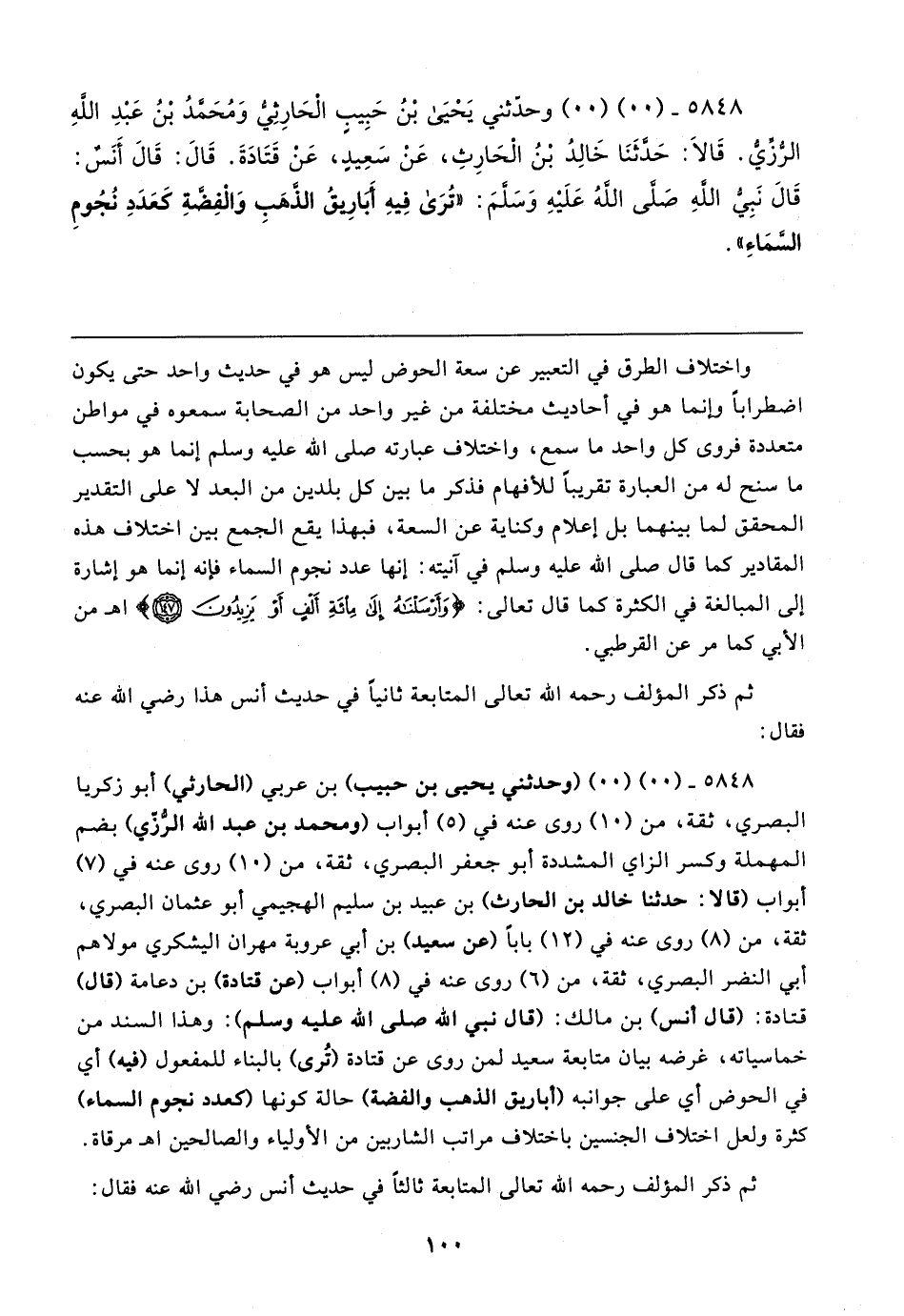 ٥٨٤٨ - (٠٠) (٠٠) (وحدثني يحيى بن حبيب) بن عربي (الحارثي) أبو زكريا البصري، ثقة، من (١٠) روى عنه في (٥) أبواب (ومحمد بن عبد الله الرُّزّي) بضم المهملة وكسر الزاي المشددة أبو جعفر البصري، ثقة، من (١٠) روى عنه في (٧) أبواب (قالا: حدثنا خالد بن الحارث) بن عبيد بن سليم الهجيمي أبو عثمان البصري، ثقة، من (٨) روى عنه في (١٢) بابا (عن سعيد) بن أبي عروبة مهران اليشكري مولاهم أبي النضر البصري، ثقة، من (٦) روى عنه في (٨) أبواب (عن قتادة) بن دعامة (قال) قتادة: (قال أنس) بن مالك: (قال نبي الله - صلى الله عليه وسلم -): وهذا السند من خماسياته، غرضه بيان متابعة سعيد لمن روى عن قتادة (تُرى) بالبناء للمفعول (فيه) أي في الحوض أي على جوانبه (أباريق الذهب والفضة) حالة كونها (كعدد نجوم السماء) كثرة ولعل اختلاف الجنسين باختلاف مراتب الشاربين من الأولياء والصالحين اهـ مرقاة. ثم ذكر المؤلف -رحمه الله تعالى- المتابعة ثالثًا في حديث أنس - رضي الله عنه - فقال: