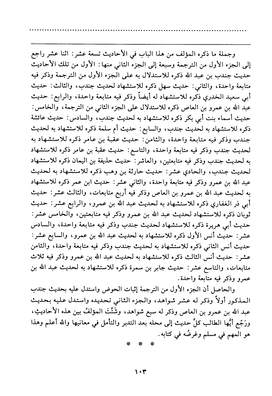 والحاصل أن الجزء الأول من الترجمة إثبات الحوض واستدل عليه بحديث جندب المذكور أولًا وذكر له عشر شواهد، والجزء الثاني تحديده واستدل عليه بحديث عبد الله بن عمرو بن العاص وذكر له سبع شواهد، وشَتَّتَ المؤلفُ بين هذه الأحاديثِ، ورَجَّع أنّها الطالب كل حديث إلى محله بعد التدبر والتأمل في معانيها والله أعلم وهذا هو المهم في مسلم وغرضُه في كتابه.