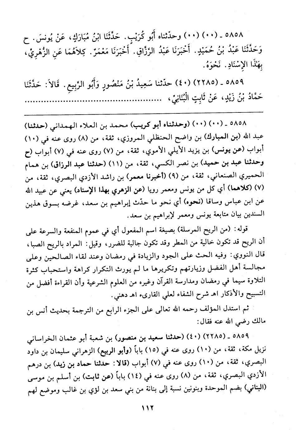 ٥٨٥٨ - (٠٠) (٠٠) (وحدثناه أبو كريب) محمَّد بن العلاء الهمداني (حدثنا) عبد الله (بن المبارك) بن واضح الحنظلي المروزي، ثقة، من (٨) روى عنه في (١٠) أبواب (عن يونس) بن يزيد الأيلي الأموي، ثقة، من (٧) روى عنه في (٧) أبواب (خ وحدثنا عبد بن حميد) بن نصر الكسي، ثقة، من (١١) (حدثنا عبد الرزاق) بن همام الحميري الصنعاني، ثقة، من (٩) (أخبرنا معمر) بن راشد الأزدي البصري، ثقة، من (٧) (كلاهما) أي كل من يونس ومعمر رويا (عن الزهري بهذا الإسناد) يعني عن عبيد الله عن ابن عباس وساقا (نحوه) أي نحو ما حدّث إبراهيم بن سعد، غرضه بسوق هذين السندين بيان متابعة يونس ومعمر لإبراهيم بن سعد.