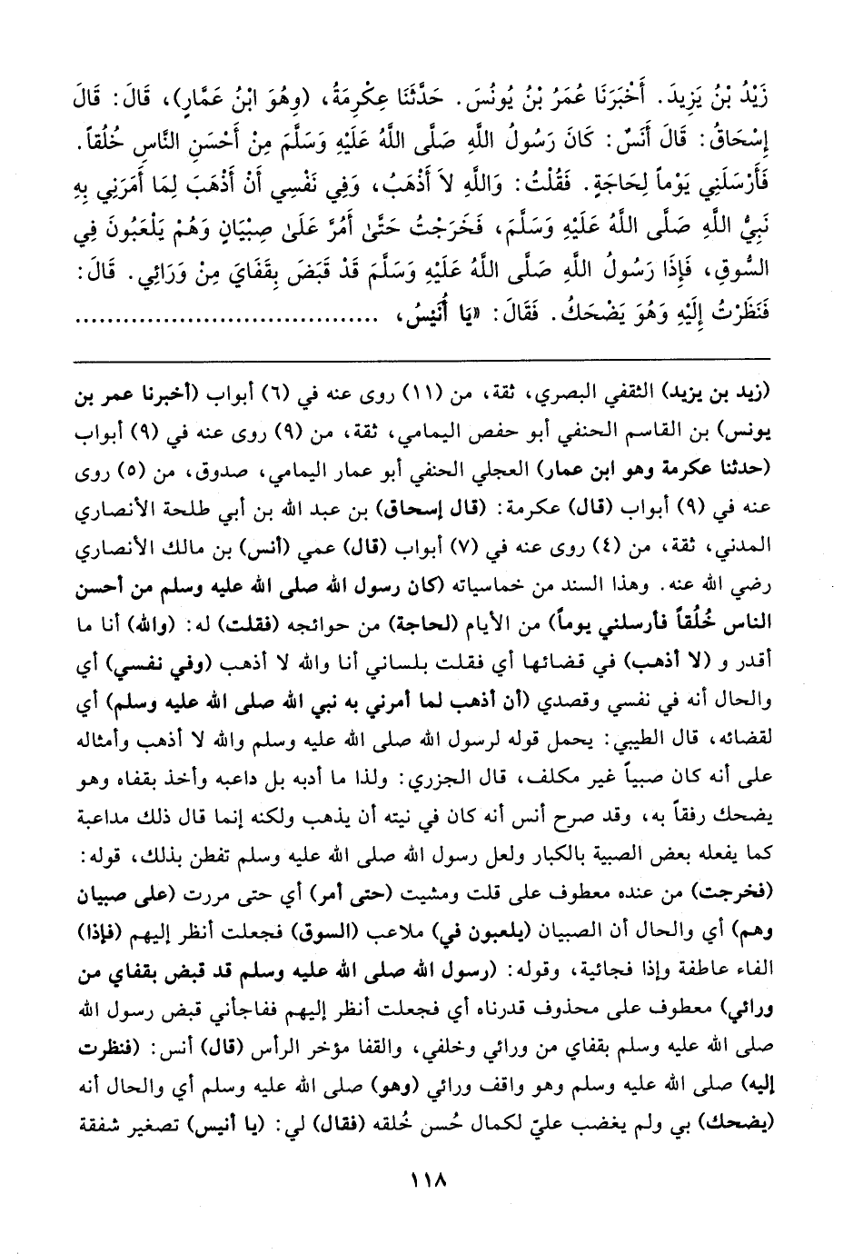 زَيدُ بْنُ يَزِيدَ. أَخْبَرَنَا عُمَرُ بْنُ يُونُسَ. حَدَّثَنَا عِكرِمَةُ، (وهُوَ ابْنُ عَمَّارٍ)، قَال: قَال إِسْحَاقُ: قَال أَنَسٌ: كَانَ رَسُولُ الله - صلى اللهُ عَلَيهِ وَسلمَ مِنْ أَحْسَنِ النَّاسِ خُلُقًا. فَأَرْسَلَنِي يَوْمًا لِحَاجَةٍ. فَقُلْتُ: وَاللهِ لَا أَذْهَبُ، وَفِي نَفْسِي أن أَذْهَبَ لِمَا أَمَرَنِي بِهِ نَبِيُّ الله -صلَّى الله عَلَيهِ وَسلمَ-، فَخَرَجْتُ حَتى أَمُرَّ َعَلَى صِبْيَانٍ وَهُمْ يَلْعَبُونَ في السُّوقِ، فَإِذَا رَسُولُ الله - صلى الله عَلَيهِ وَسلمَ- قَدْ قَبَضَ بِقَفَايَ مِنْ وَرَائِي. قَال: فَنَظَرْتُ إِلَيهِ وَهُوَ يَضحَكُ. فَقَال: "يَا أُنَيسُ،