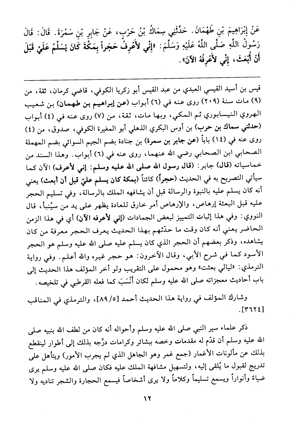 عَن إِبْرَاهِيمَ بْنِ طَهْمَانَ. حَدَّثَنِي سِمَاكُ بن حَرْبٍ، عَنْ جَابِرِ بْنِ سَمُرَةَ. قَال: قَال رَسُولُ اللهِ صَلَّى اللهُ عَلَيهِ وَسَلَّمَ: "إِنِّي لأَعْرِفُ حَجَرًا بِمَكَّةَ كَانَ يُسَلِّمُ عَلَيَّ قَبْلَ أَنْ أُبْعَثَ، إِنِّي لأَعْرِفُهُ الآنَ"
