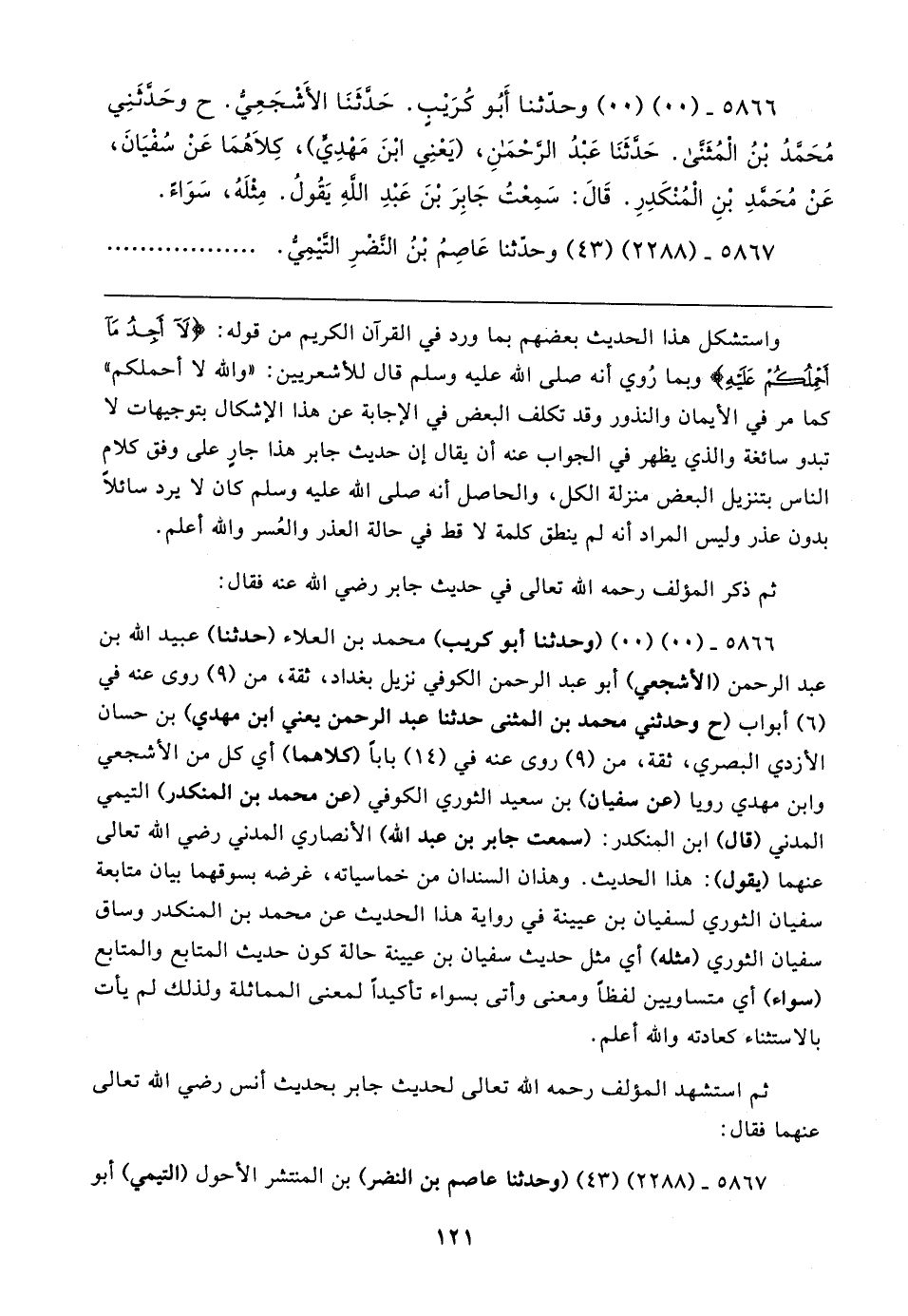 ٥٨٦٦ - (٠٠) (٠٠) (وحدثنا أبو كريب) محمَّد بن العلاء (حدثنا) عبيد الله بن عبد الرحمن (الأشجعي) أبو عبد الرحمن الكوفي نزيل بغداد، ثقة، من (٩) روى عنه في (٦) أبواب (ح وحدثني محمَّد بن المثنى حدثنا عبد الرحمن يعني ابن مهدي) بن حسان الأزدي البصري، ثقة، من (٩) روى عنه في (١٤) بابا (كلاهما) أي كل من الأشجعي وابن مهدي رويا (عن سفيان) بن سعيد الثوري الكوفي (عن محمَّد بن المنكدر) التيمي المدني (قال) ابن المنكدر: (سمعت جابر بن عبد الله) الأنصاري المدني - رضي الله تعالى عنهما - (يقول): هذا الحديث. وهذان السندان من خماسياته، غرضه بسوقهما بيان متابعة سفيان الثوري لسفيان بن عيينة في رواية هذا الحديث عن محمَّد بن المنكدر وساق سفيان الثوري (مثله) أي مثل حديث سفيان بن عيينة حالة كون حديث المتابع والمتابع (سواء) أي متساويين لفظًا ومعنى وأتى بسواء تأكيدًا لمعنى المماثلة ولذلك لم يأت بالاستثناء كعادته والله أعلم.
