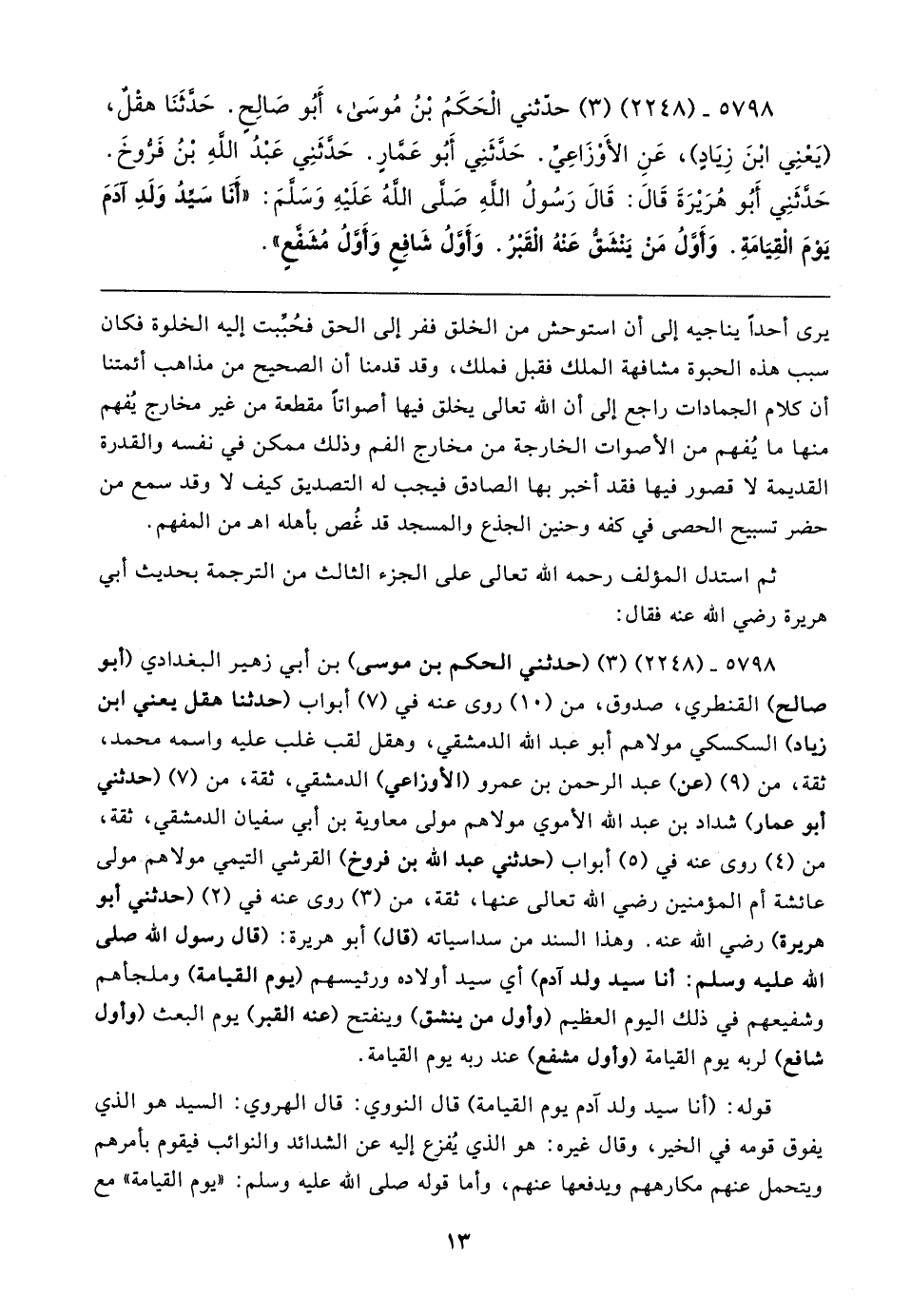 ٥٧٩٨ - (٢٢٤٨) (٣) (حدثني الحكم بن موسى) بن أبي زهير البغدادي (أبو صالح) القنطري، صدوق، من (١٠) روى عنه في (٧) أبواب (حَدَّثَنَا هقل يعني ابن زياد) السكسكي مولاهم أبو عبد الله الدمشقي، وهقل لقب غلب عليه واسمه محمد، ثقة، من (٩) (عن) عبد الرحمن بن عمرو (الأوزاعي) الدمشقي، ثقة، من (٧) (حدثني أبو عمار) شداد بن عبد الله الأموي مولاهم مولى معاوية بن أبي سفيان الدمشقي، ثقة، من (٤) روى عنه في (٥) أبواب (حدثني عبد الله بن فروخ) القرشي التيمي مولاهم مولى عائشة أم المؤمنين رضي الله تعالى عنها، ثقة، من (٣) روى عنه في (٢) (حدثني أبو هريرة) رضي الله عنه. وهذا السند من سداسياته (قال) أبو هريرة: (قال رسول الله صلى الله عليه وسلم: أنا سيد ولد آدم) أي سيد أولاده ورئيسهم (يوم القيامة) وملجأهم وشفيعهم في ذلك اليوم العظيم (وأول من ينشق) وينفتح (عنه القبر) يوم البعث (وأول شافع) لربه يوم القيامة (وأول مشفع) عند ربه يوم القيامة.