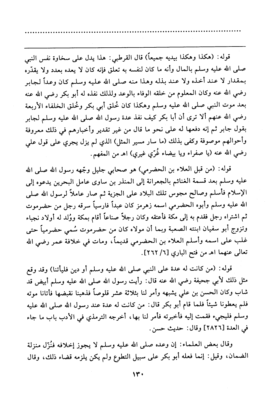 قوله: (هكذا وهكذا بيديه جميعًا) قال القرطبي: هذا يدل على سخاوة نفس النبي صلى الله عليه وسلم بالمال وأنه ما كان لنفسه به تعلق فإنه كان لا يعده بعدد ولا يقدّره بمقدار لا عند أخذه ولا عند بذله وهذا منه - صلى الله عليه وسلم - كان وعدًا لجابر - رضي الله عنه - وكان المعلوم من خلقه الوفاء بالوعد ولذلك نفذه له أبو بكر رضي الله عنه بعد موت النبي صلى الله عليه وسلم وهكذا كان خُلق أبي بكر وخُلق الخلفاء الأربعة رضي الله عنهم ألا ترى أن أبا بكر كيف نفذ عدة رسول الله صلى الله عليه وسلم لجابر يقول جابر ثم إنه دفعها له على نحو ما قال من غير تقدير وأخبارهم في ذلك معروفة وأحوالهم موصوفة وكفى بذلك (ما سار مسير المثل) الذي لم يزل يجري على قول علي رضي الله عنه (يا صفراء ويا بيضاء غُزي غيري) اهـ من المفهم.