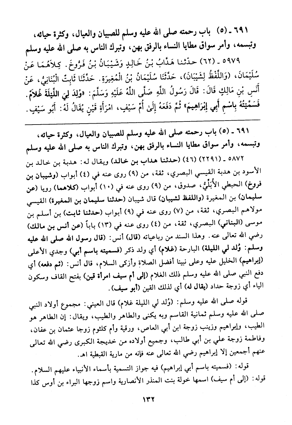 ٥٨٧٢ - (٢٢٩١) (٤٦) (حدثنا هداب بن خالد) ويقال له: هدبة بن خالد بن الأسود بن هدبة القيسي البصري، ثقة، من (٩) روى عنه في (٤) أبواب (وشيبان بن فروخ) الحبطي الأُبَليُّ، صدوق، من (٩) روى عنه في (١٠) أبواب كلاهما) رويا (عن سليمان) بن المغيرة (واللفظ لشيبان) قال شيبان (حدثنا سليمان بن المغيرة) القيسي مولاهم البصري، ثقة، من (٧) روى عنه في (٩) أبواب (حدثنا ثابت) بن أسلم بن موسى (البناني) البصري، ثقة، من (٤) روى عنه في (١٣) بابا (عن أنس بن مالك) رضي الله تعالى عنه. وهذا السند من رباعياته (قال) أنس: (قال رسول الله - صلى الله عليه وسلم - لي الله عليه وسلم: وُلد لي الليلة) البارحة (غلام) أي وّلد ذكر (فسميته باسم أبي) وجدي الأعلى (إبراهيم) الخليل عليه وعلى نبينا أفضل الصلاة وأزكى السلام، قال أنس: (ثم دفعه) أي دفع النبي صلى الله عليه وسلم ذلك الغلام (إلى أم سيف امرأة قين) بفتح القاف وسكون الياء أي زوجة حداد (يقال له) أي لذلك القين (أبو سيف).