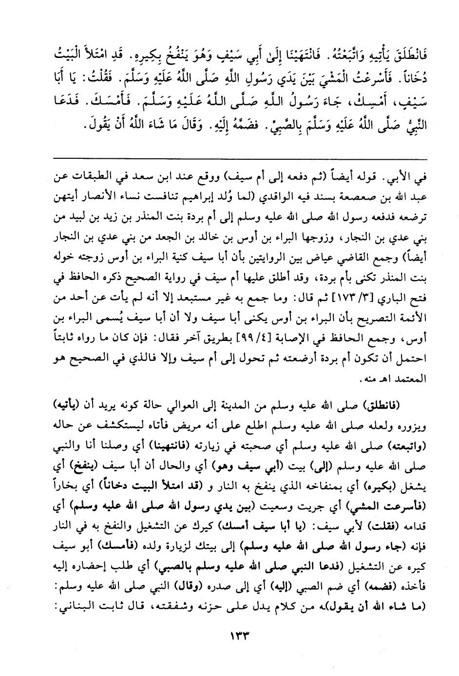 فَانطَلَقَ يَأْتِيهِ وَاتَّبَعْتُهُ. فَانتَهَينَا إلى أَبِي سَيفٍ وَهُوَ يَنْفُخُ بِكِيرِهِ. قَدِ امْتَلأَ الْبَيتُ دُخَانًا. فَأسْرعْتُ المَشْيَ بَينَ يَدَي رَسُولِ الله صلى الله عَلَيهِ وَسلَّمَ. فَقُلْتُ: يَا أَبَا سَيفٍ، أَمْسِكْ، جَاءَ رَسُولُ الله صلى الله عَلَيهِ وَسلمَ. فَأَمْسَكَ. فَدَعَا النبي صلى الله عَلَيهِ وَسلمَ بِالصَّبِيِّ. فضَمَّهُ إِلَيهِ. وَقَال مَا شَاءَ الله أن يَقُولَ