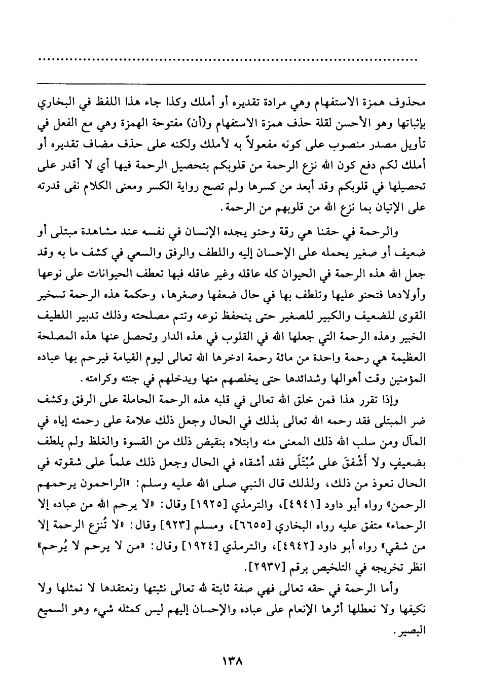 وإذا تقرر هذا فمن خلق الله تعالى في قلبه هذه الرحمة الحاملة على الرفق وكشف ضر المبتلى فقد رحمه الله تعالى بذلك في الحال وجعل ذلك علامة على رحمته إياه في المآل ومن سلب الله ذلك المعنى منه وابتلاه بنقيض ذلك من القسوة والغلظ ولم يلطف بضعيفٍ ولا أَشْفقَ على مُبْتَلَى فقد أشقاه في الحال وجعل ذلك علمًا على شقوته في الحال نعوذ من ذلك، ولذلك قال النبي صلى الله عليه وسلم: "الراحمون يرحمهم الرحمن" رواه أبو داود [٤٩٤١] , والترمذي [١٩٢٥] وقال: "لا يرحم الله من عباده إلا الرحماء" متفق عليه رواه البخاري [٦٦٥٥] , ومسلم [٩٢٣] وقال: "لا تُنزع الرحمة إلا من شقي" رواه أبو داود [٤٩٤٢] , والترمذي [١٩٢٤] وقال: "من لا يرحم لا يُرحم" انظر تخريجه في التلخيص برقم [٢٩٣٧].