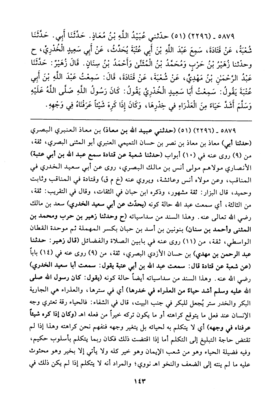 ٥٨٧٩ - (٢٢٩٦) (٥١) حدّثني عُبَيدُ الله بْنُ مُعَاذٍ. حَدَّثَنَا أَبِي. حَدَّثَنَا شُعْبَةُ، عَنْ قَتَادَةَ، سَمِعَ عَبْدَ الله بْنَ أَبِي عُتْبَةَ يحدِّثُ، عَنْ أَبِي سَعِيدٍ الخُدْرِي، ح وحدّثنا زُهَيرُ بْنُ حَرْبٍ وَمُحَمَّدُ بْنُ المُثَنَّى وَأَحْمَدُ بْنُ سِنَانٍ. قَال زُهَيرٌ: حَدَّثَنَا عَبْدُ الرحْمَنِ بْنُ مَهْدِيٍّ، عَنْ شُعْبَةَ، عَنْ قَتَادَةَ، قَال: سَمِعتُ عَبدَ الله بْنَ أبي عُتْبَةَ يَقُولُ: سَمِعتُ أَبَا سَعِيدٍ الْخُدْرِيَّ يَقُولُ: كَانَ رَسُولُ الله صلى الله عَلَيهِ وَسلمَ أَشَدَّ حَيَاءَ مِنَ الْعَذْرَاءِ في خِدْرِهَا، وَكَانَ إِذَا كَرِهَ شَيئًا عَرَفنَاهُ في وَجْهِهِ