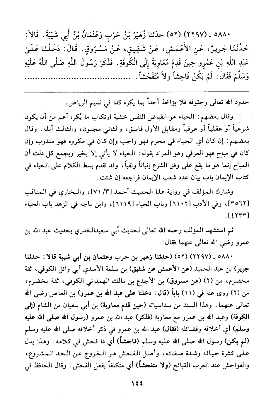 ٥٨٨٠ - (٢٢٩٧) (٥٢) (حدثنا زهير بن حرب وعثمان بن أبي شيبة قالا: حدثنا جرير) بن عبد الحميد (عن الأعمش عن شقيق) بن سلمة الأسدي أبي وائل الكوفي، ثقة مخضرم، من (٢) (عن مسروق) بن الأجدع بن مالك الهمداني الكوفي، ثقة مخضرم، من (٢) روى عنه في (١١) بابا (قال: دخلنا على عبد الله بن عمرو) بن العاص رضي الله تعالى عنهما. وهذا السند من سداسياته (حين قدم معاوية) بن أبي سفيان من الشام (إلى الكوفة) وعبد الله بن عمرو مع معاوية (فدكر) عبد الله بن عمرو (رسول الله صلى الله عليه وسلم) أي أخلاقه وفضائله (فقال) عبد الله بن عمرو في ذكر أخلاقه صلى الله عليه وسلم (لم يكن) رسول الله صلى الله عليه وسلم (فاحشًا) أي ذا فحش في كلامه. وهذا يدل على كثرة حيائه وشدة صفائه، وأصل الفحش هو الخروج عن الحد المشروع، والفواحش عند العرب القبائح (ولا متفحشًا) أي متكلفًا بفعل الفحش. وقال الحافظ في