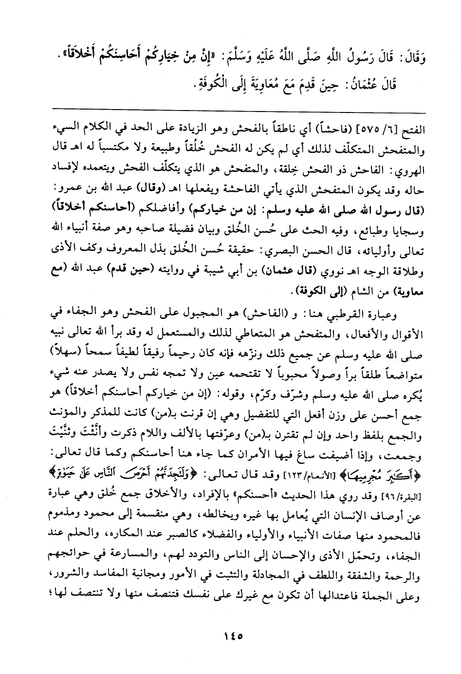 وعبارة القرطبي هنا: و (الفاحش) هو المجبول على الفحش وهو الجفاء في الأقوال والأفعال، والمتفحش هو المتعاطي لذلك والمستعمل له وقد برأ الله تعالى نبيه صلى الله عليه وسلم عن جميع ذلك ونزّهه فإنه كان رحيمًا رفيقًا لطيفًا سمحًا (سهلًا) متواضعًا طلقًا برًا وصولًا محبوبًا لا تقتحمه عين ولا تمجه نفس ولا يصدر عنه شيء يُكره صلى الله عليه وسلم وشرّف وكرّم، وقوله: (إن من خياركم أحاسنكم أخلاقًا) هو جمع أحسن على وزن أفعل التي للتفضيل وهي إن قرنت بـ (من) كانت للمذكر والمؤنث والجمع بلفظ واحد وإن لم تقترن بـ (من) وعرّفتها بالألف واللام ذكرت وأنَّثْتَ وثنَّيتَ وجمعت، وإذا أضيفت ساغ فيها الأمران كما جاء هنا أحاسنكم وكما قال تعالى: {أَكَابِرَ مُجْرِمِيهَا} [الأنعام: ١٢٣] وقد قال تعالى: {وَلَتَجِدَنَّهُمْ أَحْرَصَ النَّاسِ عَلَى حَيَاةٍ} [البقرة: ٩٦] وقد روي هذا الحديث "أحسنكم" بالإفراد، والأخلاق جمع خُلق وهي عبارة عن أوصاف الإنسان التي يُعامل بها غيره ويخالطه، وهي منقسمة إلى محمود ومذموم فالمحمود منها صفات الأنبياء والأولياء والفضلاء كالصبر عند المكاره، والحلم عند الجفاء، وتحمّل الأذى والإحسان إلى الناس والتودد لهم، والمسارعة في حوائجهم والرحمة والشفقة واللطف في المجادلة والتثبت في الأمور ومجانبة المفاسد والشرور، وعلى الجملة فاعتدالها أن تكون مع غيرك على نفسك فتنصف منها ولا تنتصف لها؛