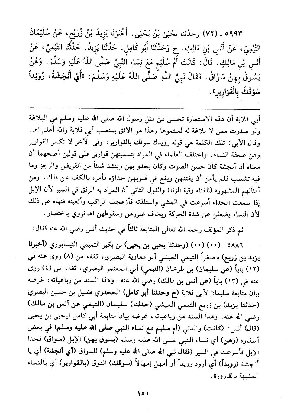 ٥٩٩٣ - (٧٢) وحدّثنا يَحْيَى بْنُ يَحْيَى. أَخْبَرَنَا يَزِيدُ بْنُ زُرَيعٍ، عَنْ سُلَيمَانَ التَّيمِيِّ، عَنْ أَنَسِ بْنِ مَالِكٍ. ح وَحَدَّثَنَا أَبُو كَامِلٍ. حَدَّثَنَا يَزِيدُ. حَدَّثَنَا التَّيمِيُّ، عَنْ أَنَسِ بْنِ مَالِكٍ. قَال: كَانَتْ أُمُّ سُلَيمٍ مَعَ نِسَاءِ النَّبِيِّ صَلَّى اللهُ عَلَيهِ وَسَلَّمَ. وَهُنَّ يَسُوقُ بِهِنَّ سَوَّاقٌ. فَقَال نَبِيُّ اللهِ صَلَّى اللهُ عَلَيهِ وَسَلَّمَ: "أَي أَنْجَشَةُ، رُوَيدًا سَوْقَكَ بِالْقَوَارِيرِ"