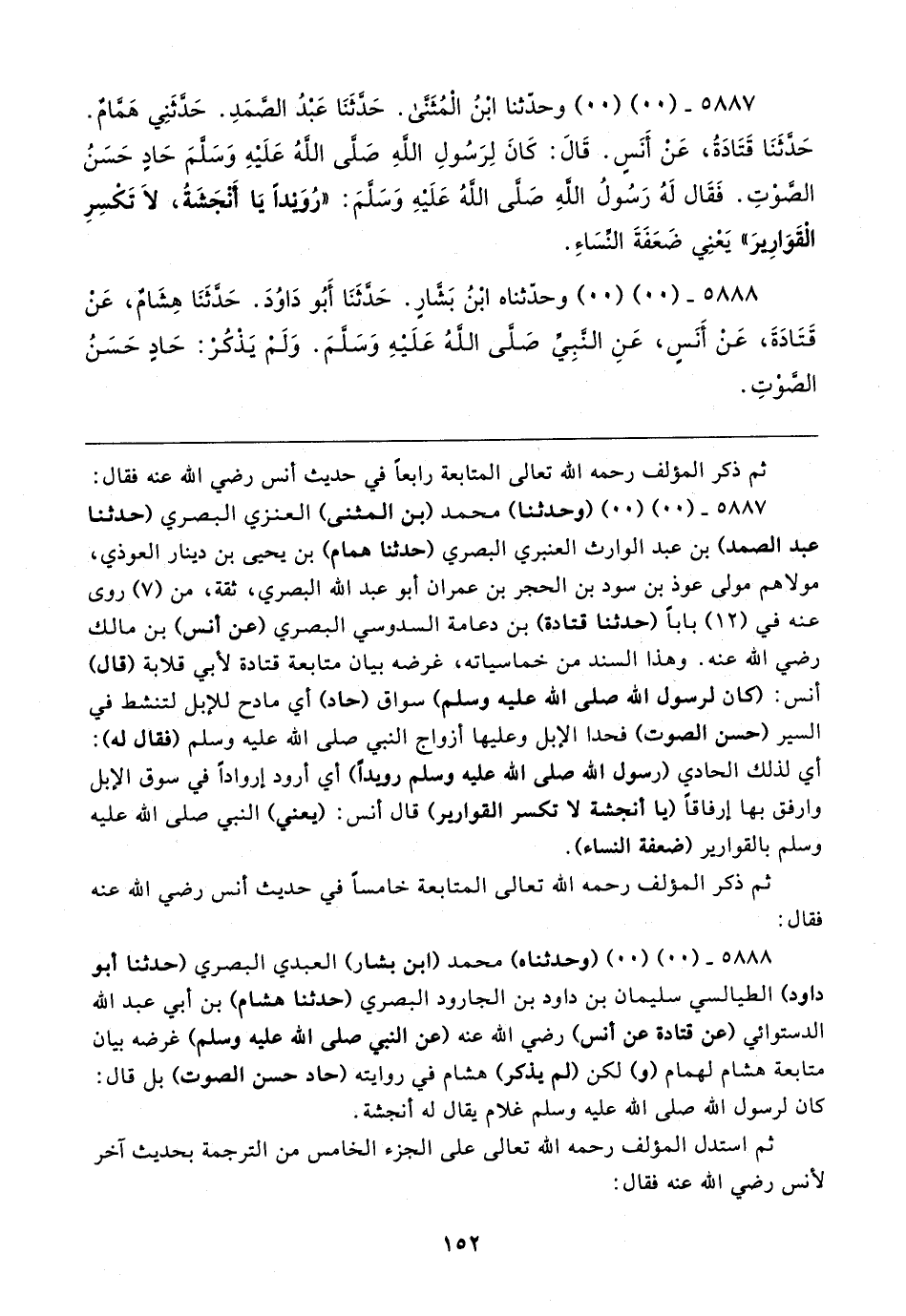 ٥٨٨٧ - (٠٠) (٠٠) (وحدثنا) محمد (بن المثنى) العنزي البصري (حدثنا عبد الصمد) بن عبد الوارث العنبري البصري (حدثنا همام) بن يحيى بن دينار العوذي، مولاهم مولى عوذ بن سود بن الحجر بن عمران أبو عبد الله البصري، ثقة، من (٧) روى عنه في (١٢) بابا (حدثنا قتادة) بن دعامة السدوسي البصري (عن أنس) بن مالك رضي الله عنه. وهذا السند من خماسياته، غرضه بيان متابعة قتادة لأبي قلابة (قال) أنس: (كان لرسول الله صلى الله عليه وسلم) سواق (حاد) أي مادح للإبل لتنشط في السير (حسن الصوت) فحدا الإبل وعليها أزواج النبي صلى الله عليه وسلم (فقال له): أي لذلك الحادي (رسول الله صلى الله عليه وسلم رويدًا) أي أرود إروادًا في سوق الإبل وارفق بها إرفاقًا (يا أنجشة لا تكسر القوارير) قال أنس: (يعني) النبي صلى الله عليه وسلم بالقوارير (ضعفة النساء).