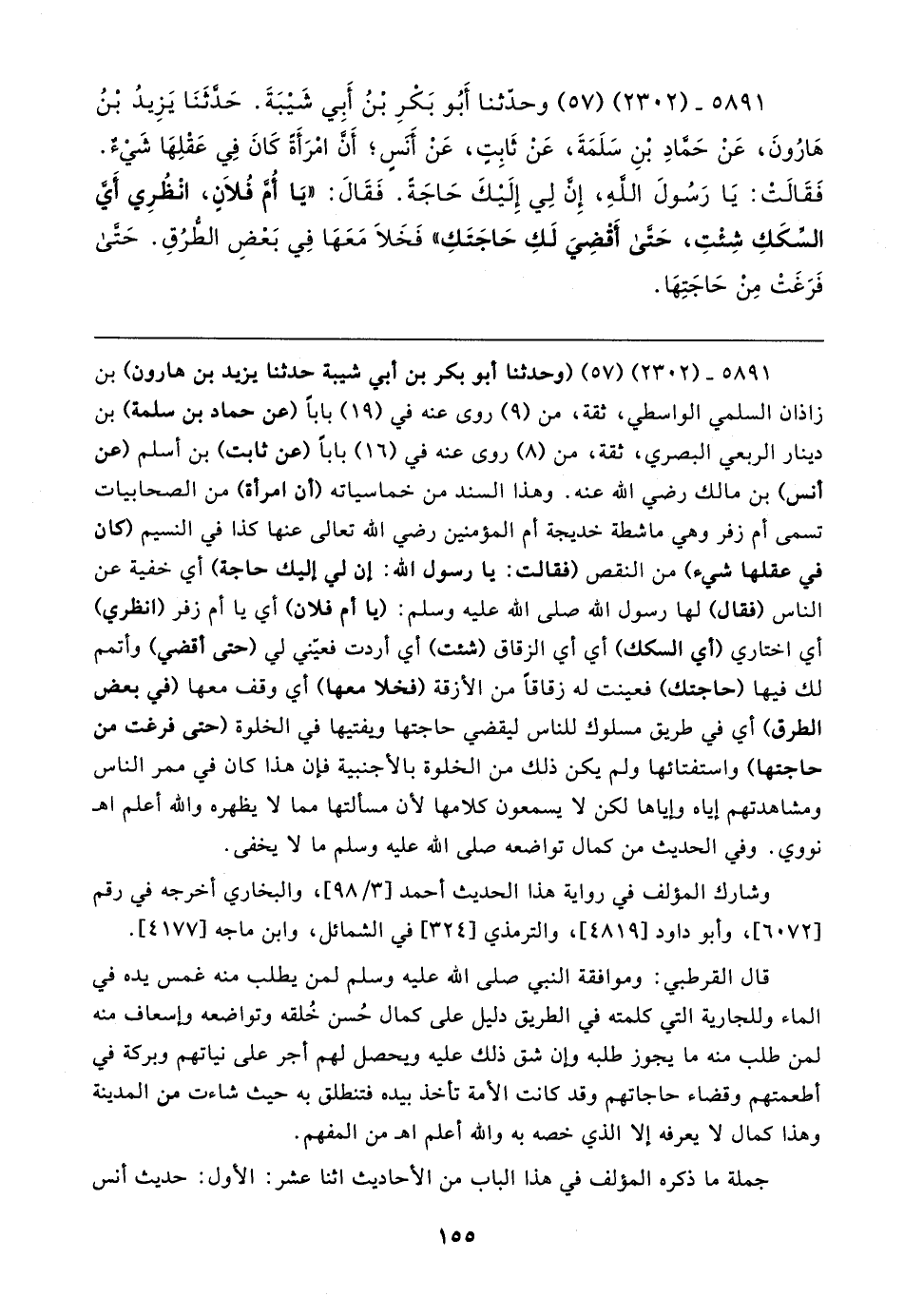 ٥٨٩١ - (٢٣٠٢) (٥٧) (وحدثنا أبو بكر بن أبي شيبة حدثنا يزيد بن هارون) بن زاذان السلمي الواسطي، ثقة، من (٩) روى عنه في (١٩) بابا (عن حماد بن سلمة) بن دينار الربعي البصري، ثقة، من (٨) روى عنه في (١٦) بابا (عن ثابت) بن أسلم (عن أنس) بن مالك رضي الله عنه. وهذا السند من خماسياته (أن امرأة) من الصحابيات تسمى أم زفر وهي ماشطة خديجة أم المؤمنين رضي الله تعالى عنها كذا في النسيم (كان في عقلها شيء) من النقص (فقالت: يا رسول الله: إن لي إليك حاجة) أي خفية عن الناس (فقال) لها رسول الله صلى الله عليه وسلم: (يا أم فلان) أي يا أم زفر (انظري) أي اختاري (أي السكك) أي أي الزقاق (شئت) أي أردت فعيّني لي (حتى أقضي) وأتمم لك فيها (حاجتك) فعينت له زقاقًا من الأزقة (فخلا معها) أي وقف معها (في بعض الطرق) أي في طريق مسلوك للناس ليقضي حاجتها ويفتيها في الخلوة (حتى فرغت من حاجتها) واستفتائها ولم يكن ذلك من الخلوة بالأجنبية فإن هذا كان في ممر الناس ومشاهدتهم إياه وإياها لكن لا يسمعون كلامها لأن مسألتها مما لا يظهره والله أعلم اهـ نووي. وفي الحديث من كمال تواضعه صلى الله عليه وسلم ما لا يخفى.