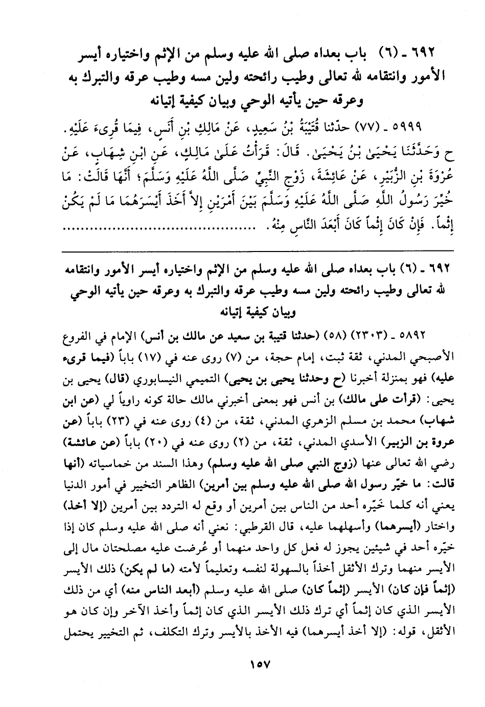 ٥٩٩٩ - (٧٧) حدَّثنا قُتَيبَةُ بْنُ سَعِيدٍ، عَنْ مَالِكِ بْنِ أَنَسٍ، فِيمَا قُرِئَ عَلَيهِ. ح وَحَدَّثَنَا يَحْيَى بْنُ يَحْيَى. قَال: قَرَأْتُ عَلَى مَالِكٍ، عَنِ ابْنِ شِهَابٍ، عَنْ عُرْوَةَ بْنِ الزُّبَيرِ، عَنْ عَائِشَةَ، زَوْجِ النَّبِيِّ صَلَّى اللهُ عَلَيهِ وَسَلَّمَ؛ أَنَّهَا قَالتْ: مَا خُيِّرَ رَسُولُ اللهِ صَلَّى اللهُ عَلَيهِ وَسَلَّمَ بَينَ أَمْرَينِ إِلَّا أَخَذَ أَيسَرَهُمَا مَا لَمْ يَكُنْ إِثْمًا. فَإِنْ كَانَ إِثْمًا كَانَ أَبْعَدَ النَّاسِ مِنْهُ