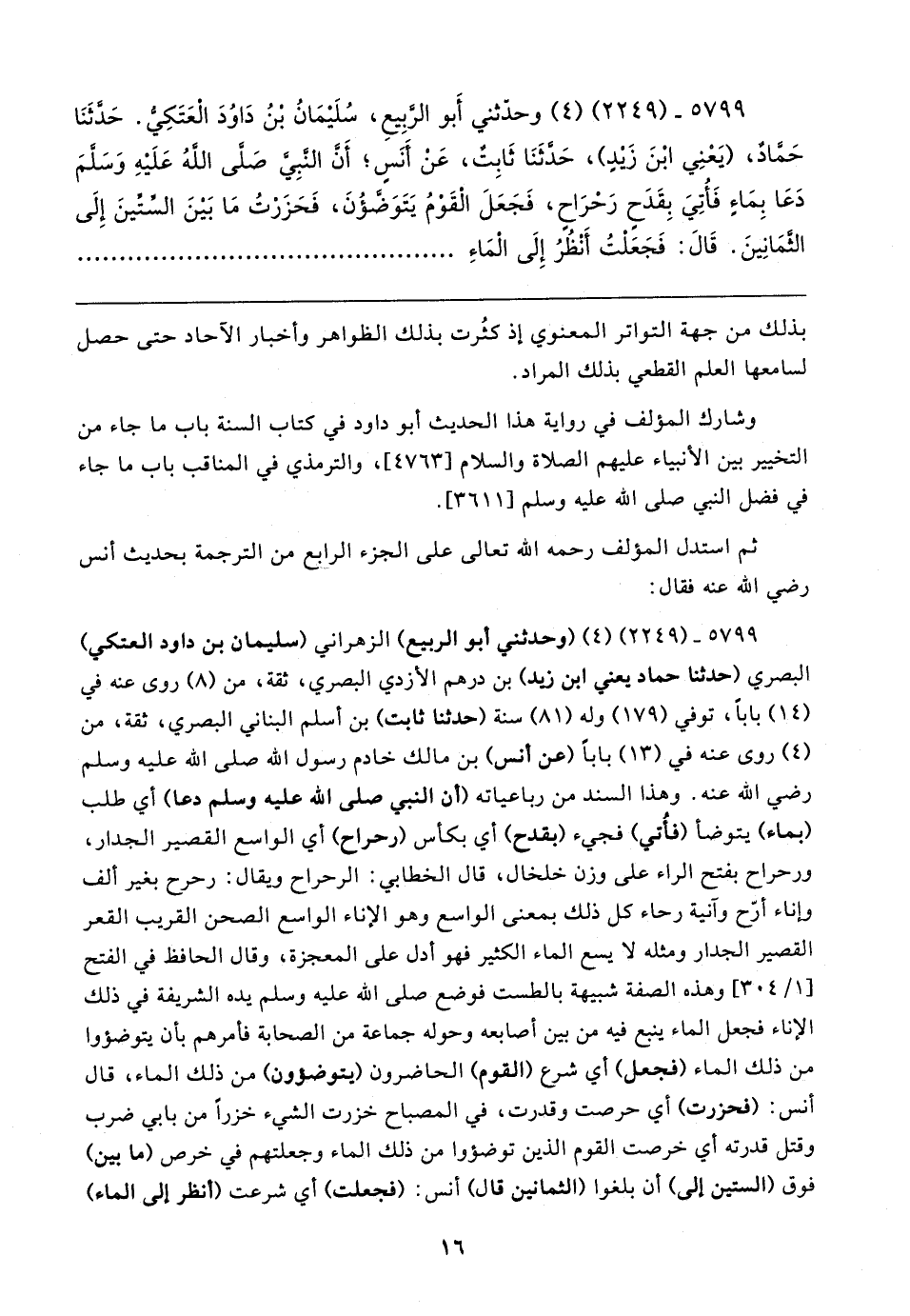 ٥٧٩٩ - (٢٢٤٩) (٤) (وحدثني أبو الربيع) الزهراني (سليمان بن داود العتكي) البصري (حَدَّثَنَا حماد يعني ابن زيد) بن درهم الأزدي البصري، ثقة، من (٨) روى عنه في (١٤) بابا، توفي (١٧٩) وله (٨١) سنة (حَدَّثَنَا ثابت) بن أسلم البناني البصري، ثقة، من (٤) روى عنه في (١٣) بابا (عن أنس) بن مالك خادم رسول الله صلى الله عليه وسلم رضي الله عنه. وهذا السند من رباعياته (أن النبي صلى الله عليه وسلم دعا) أي طلب (بماء) يتوضأ (فأُتي) فجيء (بقدح) أي بكاس (رحراح) أي الواسع القصير الجدار، ورحراح بفتح الراء على وزن خلخال، قال الخطابي: الرحراح ويقال: رحرح بغير ألف وإناء أرّح وآنية رحاء كل ذلك بمعنى الواسع وهو الإناء الواسع الصحن القريب القعر القصير الجدار ومثله لا يسع الماء الكثير فهو أدل على المعجزة، وقال الحافظ في الفتح [١/ ٣٠٤] وهذه الصفة شبيهة بالطست فوضع صلى الله عليه وسلم يده الشريفة في ذلك الإناء فجعل الماء ينبع فيه من بين أصابعه وحوله جماعة من الصحابة فأمرهم بأن يتوضؤوا من ذلك الماء (فجعل) أي شرع (القوم) الحاضرون (يتوضؤون) من ذلك الماء، قال أنس: (فحزرت) أي حرصت وقدرت، في المصباح خزرت الشيء خزرًا من بابي ضرب وقتل قدرته أي خرصت القوم الذين توضؤوا من ذلك الماء وجعلتهم في خرص (ما بين) فوق (الستين إلى) أن بلغوا (الثمانين قال) أنس: (فجعلت) أي شرعت (انظر إلى الماء)