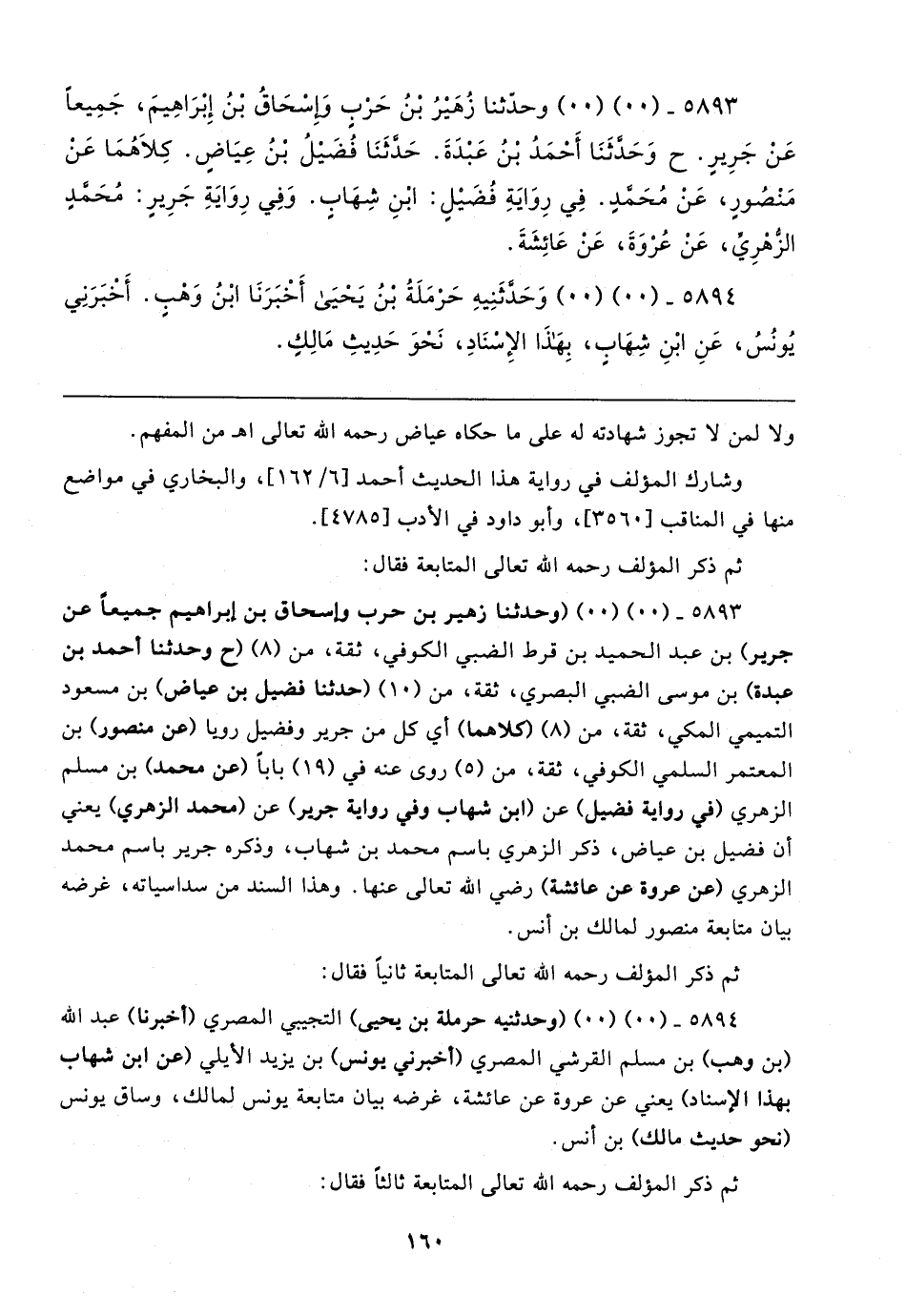 ٥٨٩٣ - (٠٠) (٠٠) (وحدثنا زهير بن حرب وإسحاق بن إبراهيم جميعًا عن جرير) بن عبد الحميد بن قرط الضبي الكوفي، ثقة، من (٨) (ح وحدثنا أحمد بن عبدة) بن موسى الضبي البصري، ثقة، من (١٠) (حدثنا فضيل بن عياض) بن مسعود التميمي المكي، ثقة، من (٨) (كلاهما) أي كل من جرير وفضيل رويا (عن منصور) بن المعتمر السلمي الكوفي، ثقة، من (٥) روى عنه في (١٩) بابا (عن محمد) بن مسلم الزهري (في رواية فضيل) عن (ابن شهاب وني رواية جرير) عن (محمد الزهري) يعني أن فضيل بن عياض، ذكر الزهري باسم محمد بن شهاب، وذكره جرير باسم محمد الزهري (عن عروة عن عائشة) رضي الله تعالى عنها. وهذا السند من سداسياته، غرضه بيان متابعة منصور لمالك بن أنس.