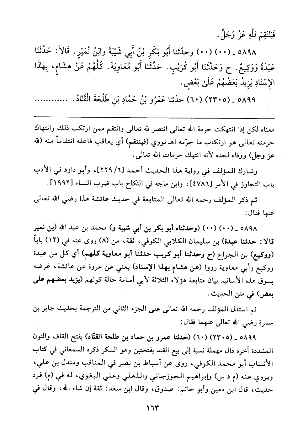 ٥٨٩٨ - (٠٠) (٠٠) (وحدثناه أبو بكر بن أبي شيبة و) محمد بن عبد الله (بن نمير قالا: حدثنا عبدة) بن سليمان الكلابي الكوفي، ثقة، من (٨) روى عنه في (١٢) بابا (ووكيع) بن الجراح (ح وحدثنا أبو كريب حدثنا أبو معاوية كلهم) أي كل من عبدة ووكيع وأبي معاوية رووا (عن هشام بهذا الإسناد) يعني عن عروة عن عائشة، غرضه بسوق هذه الأسانيد بيان متابعة هؤلاء الثلاثة لأبي أسامة حالة كونهم (يزيد بعضهم على بعض) في متن الحديث.