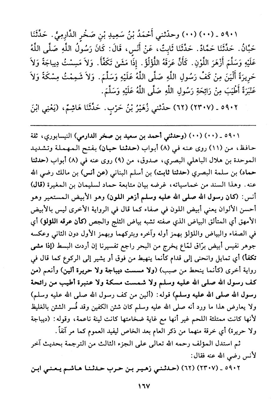٥٩٠١ - (٠٠) (٠٠) وحدّثني أَحْمَدُ بْنُ سَعِيدِ بْنِ صَخرٍ الدَّارِمِيُّ. حَدَّثَنَا حَبَّانُ. حَدَّثَنَا حَمَّادٌ. حَدَّثَنَا ثَابِتٌ، عَنْ أَنَسٍ، قَال: كَانَ رَسُولُ اللهِ صَلَّى اللهُ عَلَيهِ وَسَلَّمَ أَزْهَرَ اللَّوْنِ. كَأَنَّ عَرَقَهُ اللُّؤْلُؤُ. إِذَا مَشَى تَكَفَّأَ. وَلَا مَسِسْتُ دِيباجَةً وَلَا حَرِيرَةً أَلْيَنَ مِنْ كَفِّ رَسُولِ اللهِ صَلَّى اللهُ عَلَيهِ وَسَلَّمَ. وَلَا شَمِمْتُ مِسْكَةً وَلَا عَنْبَرَةً أَطْيَبَ مِنْ رَائِحَةِ رَسُولِ اللهِ صَلَّى اللهُ عَلَيهِ وَسَلَّمَ.