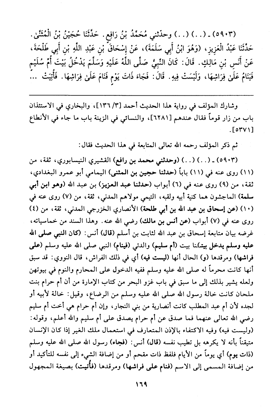(٥٩٠٣) - (٠٠) (٠٠) وحدّثني مُحَمَّدُ بْنُ رَافِعٍ. حَدَّثَنَا حُجَينُ بْنُ المُثَنَّى. حَدَّثَنَا عَبْدُ الْعَزِيزِ، (وَهُوَ ابْنُ أَبِي سَلَمَةَ)، عَنْ إِسْحَاقَ بْنِ عَبْدِ اللهِ بْنِ أَبِي طَلْحَةَ، عَنْ أَنَسِ بْنِ مَالِكٍ. قَال: كَانَ النَّبِيُّ صَلَّى اللهُ عَلَيهِ وَسَلَّمَ يَدْخُلُ بَيتَ أُمِّ سُلَيمٍ فَيَنَامُ عَلَى فِرَاشِهَا، وَلَيسَتْ فِيهِ. قَال: فَجَاءَ ذَاتَ يَوْمٍ فَنَامَ عَلَى فِرَاشِهَا. فَأُتِيَتْ