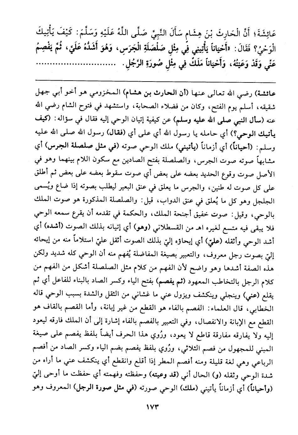 عَائِشَةَ؛ أَنَّ الْحَارِثَ بْنَ هِشَامٍ سَأَلَ النَّبِيَّ صَلَّى اللهُ عَلَيهِ وَسَلَّمَ: كَيفَ يَأْتِيكَ الْوَحْيُ؟ فَقَال: "أَحْيَانًا يَأْتِينِي فِي مِثْلِ صَلْصَلَةِ الْجَرَسِ، وَهُوَ أَشَدُّهُ عَلَيَّ، ثُمَّ يَفْصِمُ عَنِّي وَقَدْ وَعَيتُهُ، وَأَحْيَانًا مَلَك فِي مِثْلِ صُورَةِ الرَّجُلِ