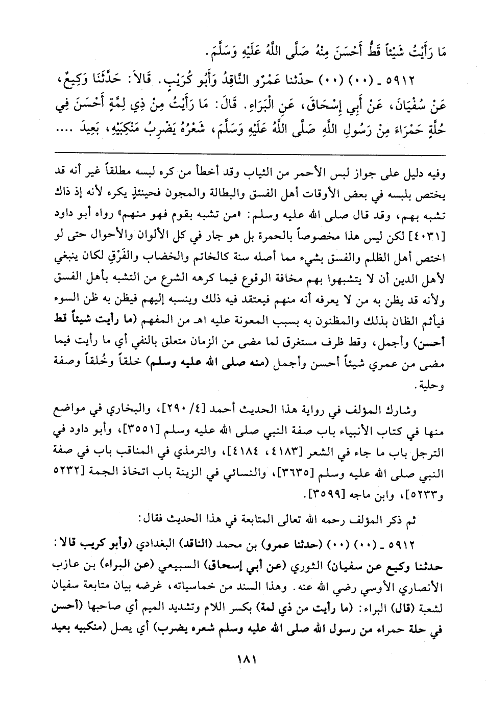 ٥٩١٢ - (٠٠) (٠٠) حدَّثنا عَمْرٌو النَّاقِدُ وَأَبُو كُرَيبٍ. قَالا: حَدَّثَنَا وَكِيعٌ، عَنْ سُفْيَانَ، عَنْ أَبِي إِسْحَاقَ، عَنِ الْبَرَاءِ. قَال: مَا رَأَيتُ مِن ذِي لِمَّةٍ أَحْسَنَ فِي حُلَّةٍ حَمْرَاءَ مِنْ رَسُولِ اللهِ صَلَّى اللهُ عَلَيهِ وَسَلَّمَ، شَعْرُهُ يَضْرِبُ مَنْكِبَيهِ، بَعِيدَ