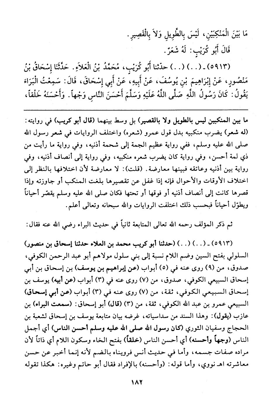 (٥٩١٣) - (٠٠) (٠٠) حدَّثنا أَبُو كُرَيبٍ، مُحَمَّدُ بْنُ الْعَلاءِ. حَدَّثَنَا إِسْحَاقُ بْنُ مَنْصُورٍ، عَنْ إِبْرَاهِيمَ بْنِ يُوسُفَ، عَنْ أَبِيهِ، عَنْ أَبِي إِسْحَاقَ، قَال: سَمِعْتُ الْبَرَاءَ يَقُولُ: كَانَ رَسُولُ اللهِ صَلَّى اللهُ عَلَيهِ وَسَلَّمَ أَحْسَنَ النَّاسِ وَجْهًا. وَأَحْسَنَهُ خَلْقًا،
