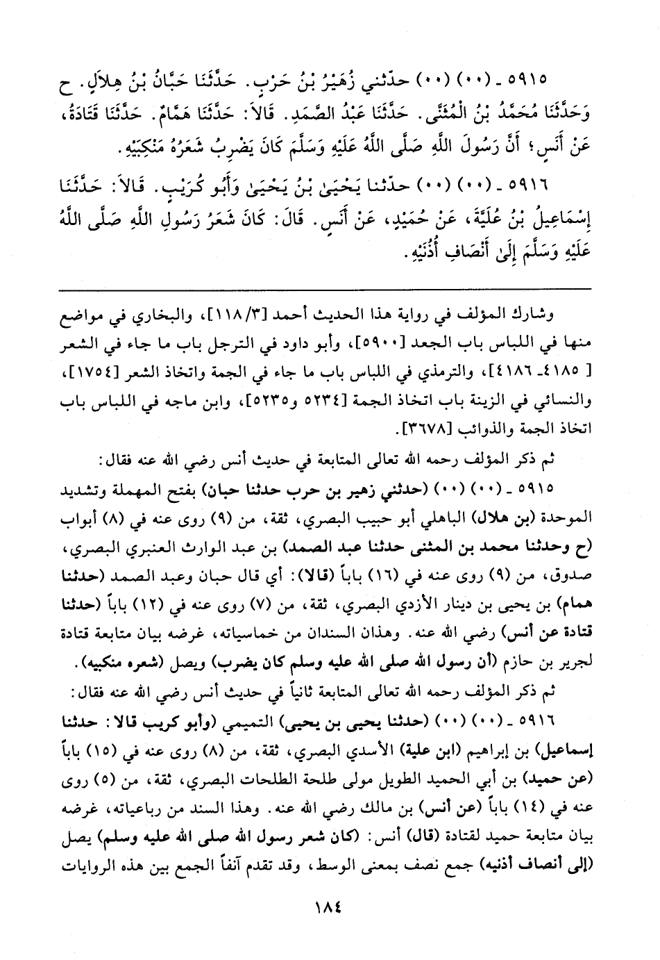 ٥٩١٥ - (٠٠) (٠٠) (حدثني زهير بن حرب حدثنا حبان) بفتح المهملة وتشديد الموحدة (بن هلال) الباهلي أبو حبيب البصري، ثقة، من (٩) روى عنه في (٨) أبواب (ح وحدثنا محمد بن المثنى حدثنا عبد الصمد) بن عبد الوارث العنبري البصري، صدوق، من (٩) روى عنه في (١٦) بابا (قالا): أي قال حبان وعبد الصمد (حدثنا همام) بن يحيى بن دينار الأزدي البصري، ثقة، من (٧) روى عنه في (١٢) بابا (حدثنا قتادة عن أنس) رضي الله عنه. وهذان السندان من خماسياته، غرضه بيان متابعة قتادة لجرير بن حازم (أن رسول الله صلى الله عليه وسلم كان يضرب) ويصل (شعره منكبيه).