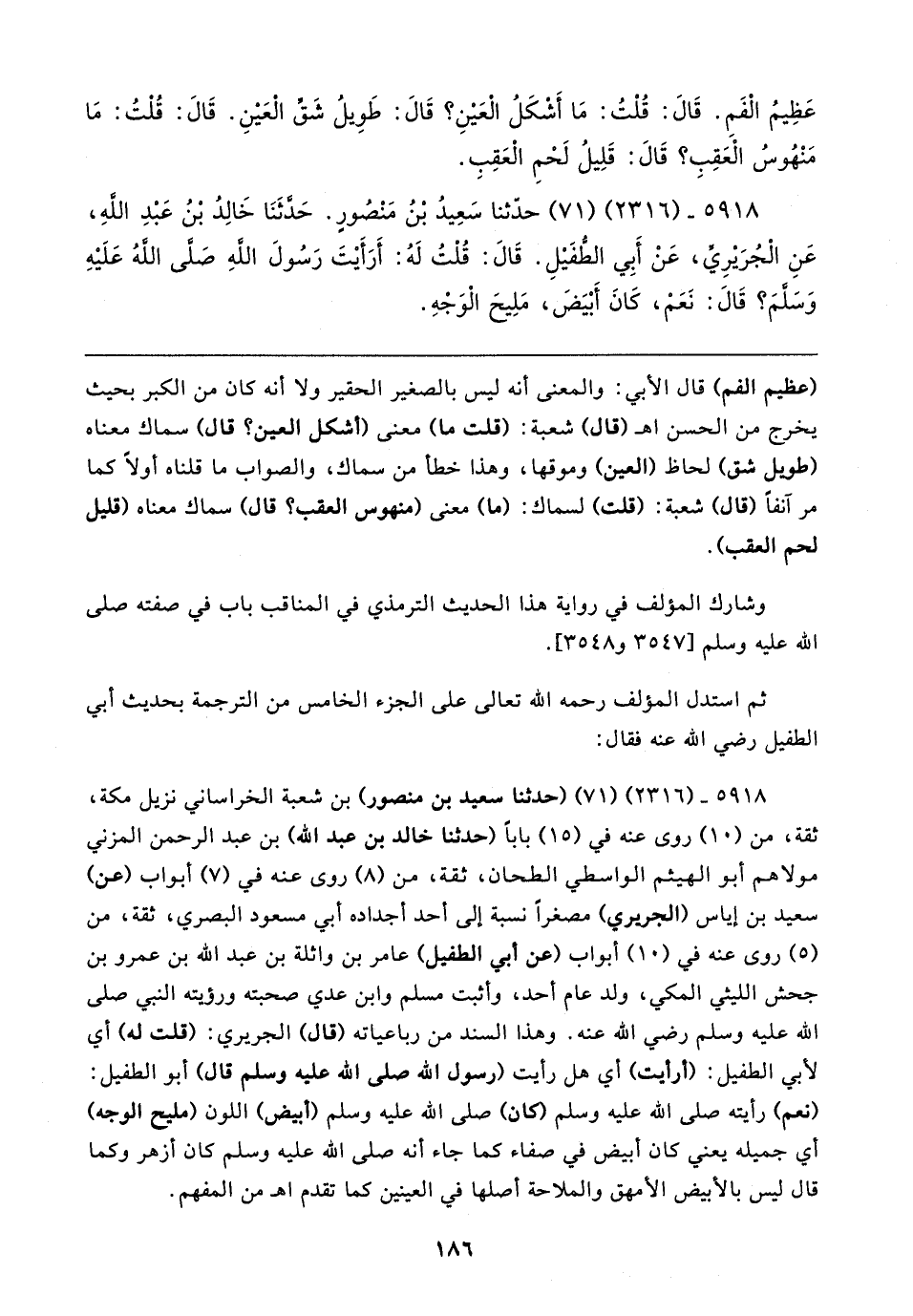 ٥٩١٨ - (٢٣١٦) (٧١) حدَّثنا سَعِيدُ بْنُ مَنْصُورٍ. حَدَّثَنَا خَالِدُ بْنُ عَبْدِ اللهِ، عَنِ الْجُرَيرِيِّ، عَنْ أَبِي الطُّفَيلِ. قَال: قُلْتُ لَهُ: أَرَأَيتَ رَسُولَ اللهِ صَلَّى اللهُ عَلَيهِ وَسَلَّمَ؟ قَال: نَعَمْ، كَانَ أَبْيَضَ، مَلِيحَ الْوَجْهِ