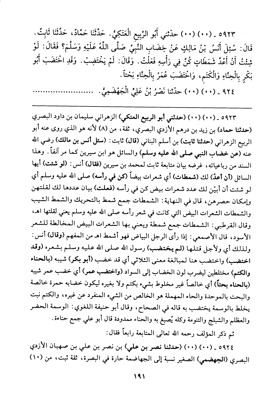 ٥٩٢٣ - (٠٠) (٠٠) حدّثني أَبُو الرَّبِيعِ الْعَتَكِيُّ. حَدَّثَنَا حَمَّادٌ، حَدَّثَنَا ثَابِتٌ. قَال: سُئِلَ أَنَسُ بْنُ مَالِكٍ عَنْ خِضَابِ النَّبِيِّ صَلَّى اللهُ عَلَيهِ وَسَلَّمَ؟ فَقَال: لَوْ شِئْتُ أَنْ أَعُدَّ شَمَطَاتٍ كُنَّ فِي رَأْسِهِ فَعَلْتُ. وَقَال: لَم يَختَضِبْ. وَقَدِ اخْتَضَبَ أَبُو بَكْرٍ بِالْحِنَّاءِ وَالْكَتَمِ، وَاخْتَضَبَ عُمَرُ بِالْحِنَّاءِ بَحْتًا.