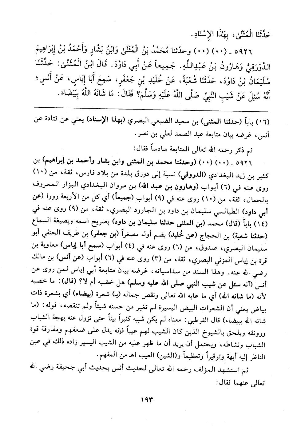 ٥٩٢٦ - (٠٠) (٠٠) (وحدثنا محمد بن المثنى وابن بشار وأحمد بن إبراهيم) بن كثير بن زيد البغدادي (الدروقي) نسبة إلى دورق بلدة من بلاد فارس، ثقة، من (١٠) روى عنه في (٦) أبواب (وهارون بن عبد الله) بن مروان البغدادي البزار المعروف بالحمال، ثقة، من (١٠) روى عنه في (٩) أبواب (جميعًا) أي كل من الأربعة رووا (عن أبي داود) الطيالسي سليمان بن داود بن الجارود البصري، ثقة، من (٩) روى عنه في (١٤) بابا (قال) محمد (بن المثنى حدثنا سليمان بن داود) بصريح اسمه وبصيغة السماع (حدثنا شعبة) بن الحجاج (عن خُليد) بضم أوله مصغرًا (بن جعفر) بن طريف الحنفي أبو سليمان البصري، صدوق، من (٦) روى عنه في (٤) أبواب (سمع أبا إياس) معاوية بن قرة بن إياس المزني البصري، ثقة، من (٣) روى عنه في (٦) أبواب (عن أنس) بن مالك رضي الله عنه. وهذا السند من سداسياته، غرضه بيان متابعة أبي إياس لمن روى عن أنس (أنه سئل عن شيب النبي صلى الله عليه وسلم) هل خضبه أم لا؟ (قال): ما خضبه لأنه (ما شانه الله) أي ما عابه الله تعالى ونقص جماله (بـ) شعرة (بيضاء) أي بشعرة ذات بياض يعني أن الشعرات البيض اليسيرة لم تغير من حسنه شيئًا ولم تنقصه، قوله: (ما شانه الله ببيضاء) قال القرطبي: معناه لم يكن شيبه كثيرًا بينًا حتى تزول عنه بهجة الشباب ورونقه ويلحق بالشيوخ الذين كان الشيب لهم عيبًا فإنه يدل على ضعفهم ومفارقة قوة الشباب ونشاطه، ويحتمل أن يريد أن ما ظهر عليه من الشيب اليسير زاده ذلك في عين الناظر إليه أبهة وتوقيرًا وتعظيمًا و (الشين) العيب اهـ من المفهم.