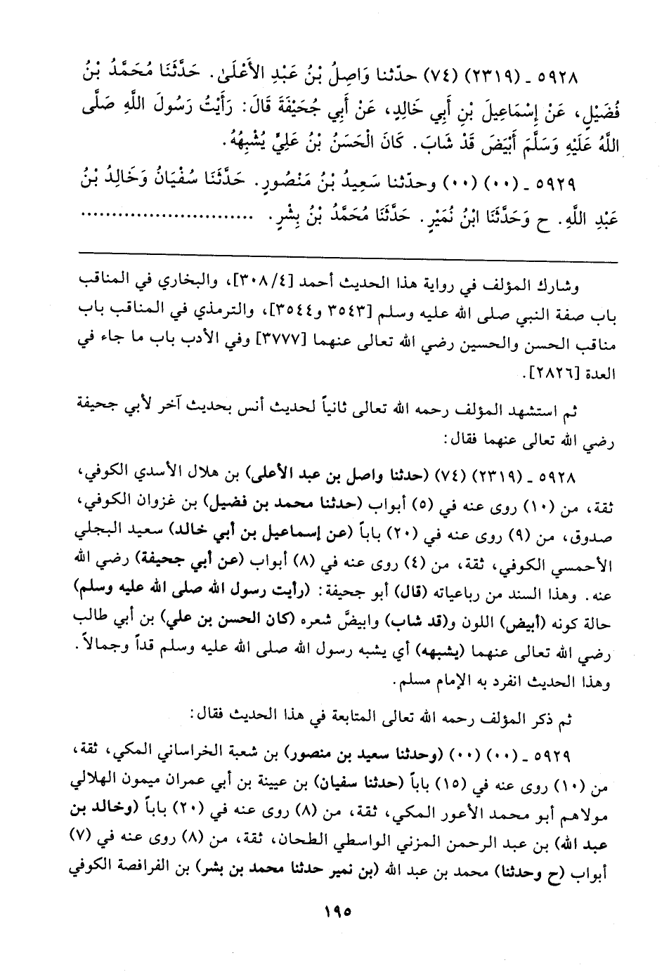 ٥٩٢٨ - (٢٣١٩) (٧٤) (حدثنا واصل بن عبد الأعلى) بن هلال الأسدي الكوفي، ثقة، من (١٠) روى عنه في (٥) أبواب (حدثنا محمد بن فضيل) بن غزوان الكوفي، صدوق، من (٩) روى عنه في (٢٠) بابا (عن إسماعيل بن أبي خالد) سعيد البجلي الأحمسي الكوفي، ثقة، من (٤) روى عنه في (٨) أبواب (عن أبي جحيفة) رضي الله عنه. وهذا السند من رباعياته (قال) أبو جحيفة: (رأيت رسول الله صلى الله عليه وسلم) حالة كونه (أبيض) اللون و (قد شاب) وابيضَّ شعره (كان الحسن بن علي) بن أبي طالب رضي الله تعالى عنهما (يشبهه) أي يشبه رسول الله صلى الله عليه وسلم قدًا وجمالًا.