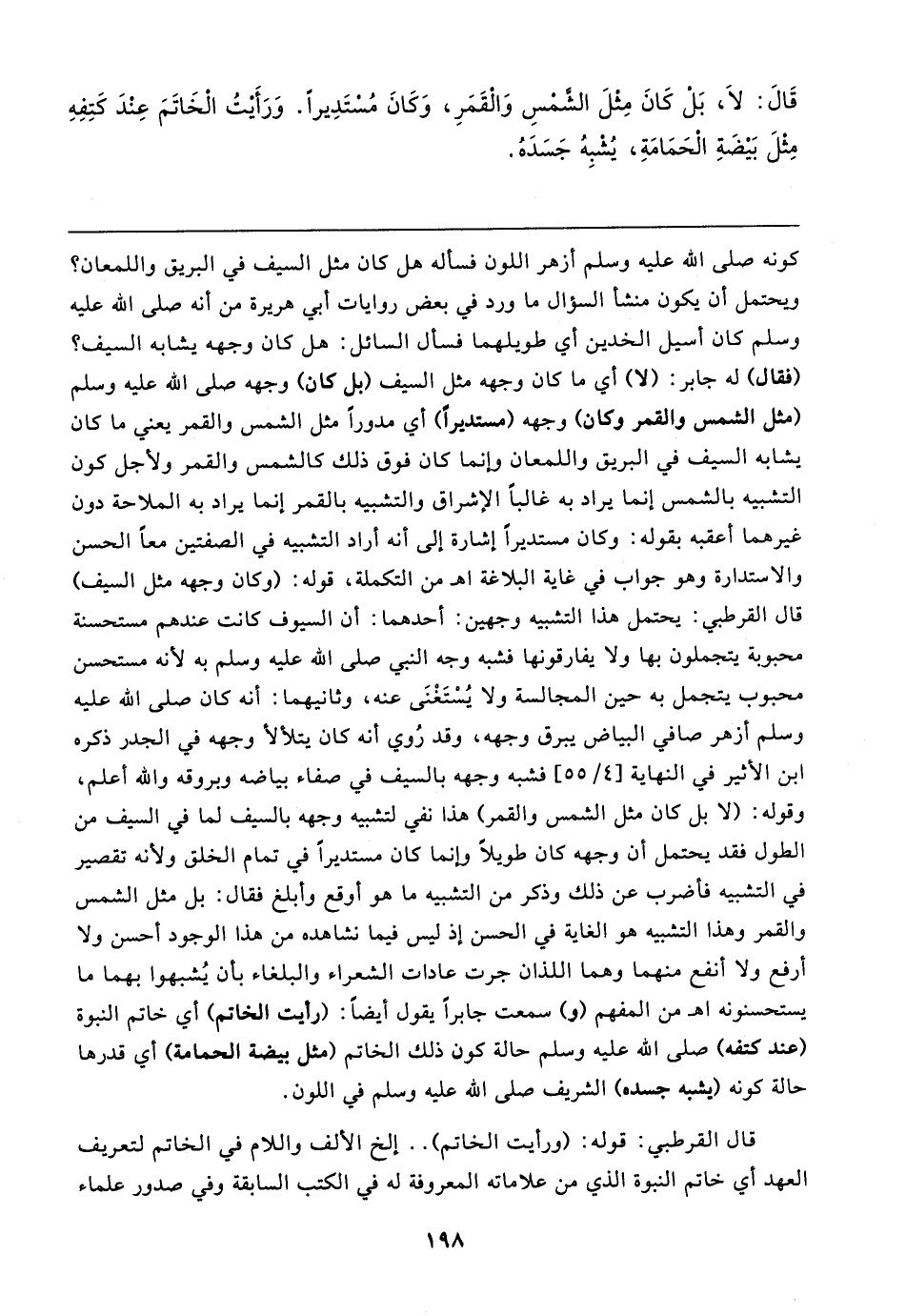 كونه صلى الله عليه وسلم أزهر اللون فسأله هل كان مثل السيف في البريق واللمعان؟ ويحتمل أن يكون منشأ السؤال ما ورد في بعض روايات أبي هريرة من أنه صلى الله عليه وسلم كان أسيل الخدين أي طويلهما فسأل السائل: هل كان وجهه يشابه السيف؟ (فقال) له جابر: (لا) أي ما كان وجهه مثل السيف (بل كان) وجهه صلى الله عليه وسلم (مثل الشمس والقمر وكان) وجهه (مستديرًا) أي مدورًا مثل الشمس والقمر يعني ما كان يشابه السيف في البريق واللمعان وإنما كان فوق ذلك كالشمس والقمر ولأجل كون التشبيه بالشمس إنما يراد به غالبًا الإشراق والتشبيه بالقمر إنما يراد به الملاحة دون غيرهما أعقبه بقوله: وكان مستديرًا إشارة إلى أنه أراد التشبيه في الصفتين معًا الحسن والاستدارة وهو جواب في غاية البلاغة اهـ من التكملة، قوله: (وكان وجهه مثل السيف) قال القرطبي: يحتمل هذا التشبيه وجهين: أحدهما: أن السيوف كانت عندهم مستحسنة محبوبة يتجملون بها ولا يفارقونها فشبه وجه النبي صلى الله عليه وسلم به لأنه مستحسن محبوب يتجمل به حين المجالسة ولا يُسْتَغْنَى عنه، وثانيهما: أنه كان صلى الله عليه وسلم أزهر صافي البياض يبرق وجهه، وقد رُوي أنه كان يتلألأ وجهه في الجدر ذكره ابن الأثير في النهاية [٤/ ٥٥] فشبه وجهه بالسيف في صفاء بياضه وبروقه والله أعلم، وقوله: (لا بل كان مثل الشمس والقمر) هذا نفي لتشبيه وجهه بالسيف لما في السيف من الطول فقد يحتمل أن وجهه كان طويلًا وإنما كان مستديرًا في تمام الخلق ولأنه تقصير في التشبيه فأضرب عن ذلك وذكر من التشبيه ما هو أوقع وأبلغ فقال: بل مثل الشمس والقمر وهذا التشبيه هو الغاية في الحسن إذ ليس فيما نشاهده من هذا الوجود أحسن ولا أرفع ولا أنفع منهما وهما اللذان جرت عادات الشعراء والبلغاء بأن يُشبهوا بهما ما يستحسنونه اهـ من المفهم (و) سمعت جابرًا يقول أيضًا: (رأيت الخاتم) أي خاتم النبوة (عند كتفه) صلى الله عليه وسلم حالة كون ذلك الخاتم (مثل بيضة الحمامة) أي قدرها حالة كونه (يشبه جسده) الشريف صلى الله عليه وسلم في اللون.