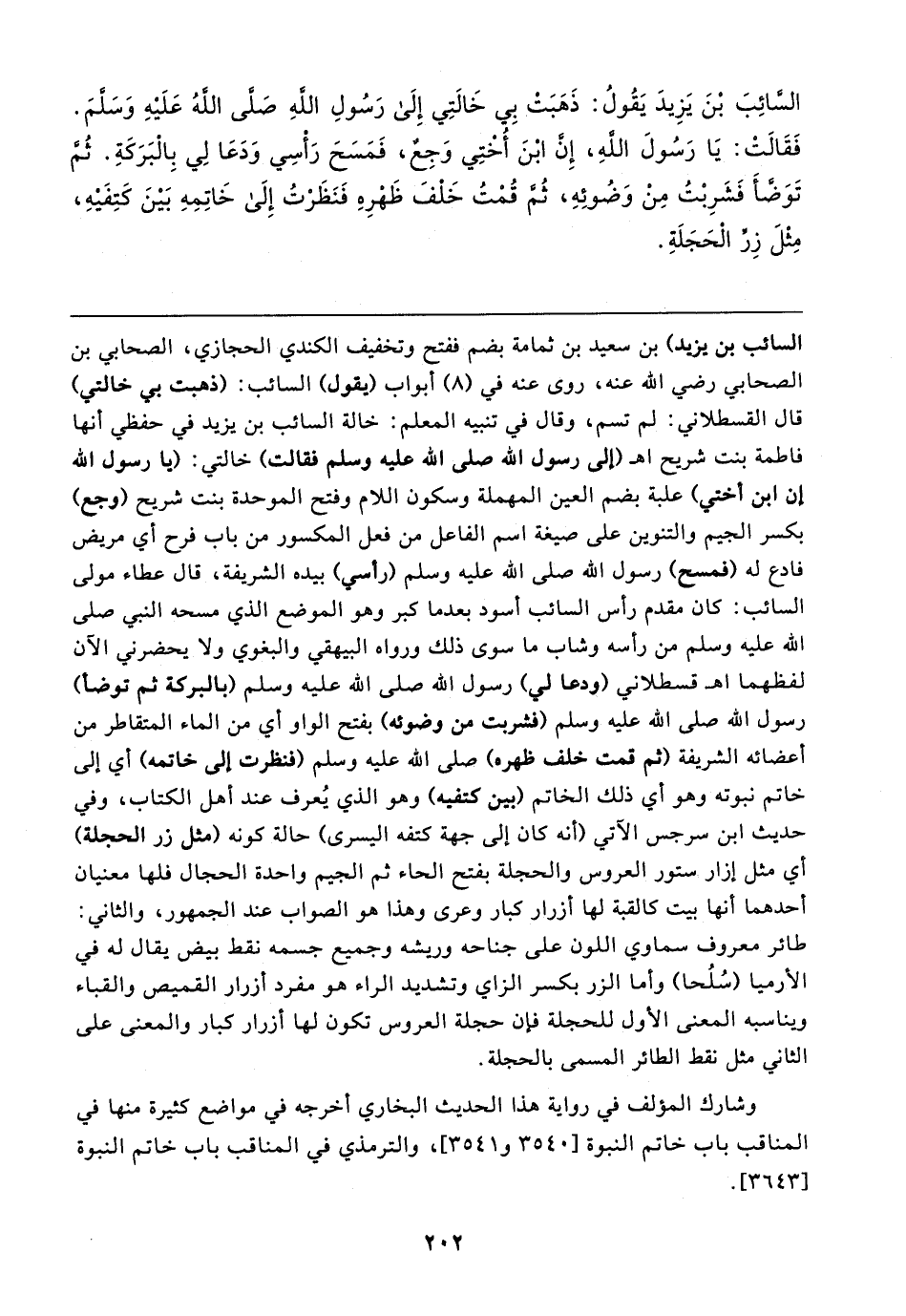 السَّائِبَ بْنَ يَزِيدَ يَقُولُ: ذَهَبَتْ بِي خَالتِي إِلَى رَسُولِ اللهِ صَلَّى اللهُ عَلَيهِ وَسَلَّمَ. فَقَالتْ: يَا رَسُولَ اللهِ، إِن ابْنَ أُخْتِي وَجِعٌ، فَمَسَحَ رَأْسِي وَدَعَا لِي بِالْبَرَكَةِ. ثُمَّ تَوَضَّأَ فَشَرِبْتُ مِنْ وَضُوئِهِ، ثُمَّ قُمْتُ خَلْفَ ظَهْرِهِ فَنَظَرْتُ إِلَى خَاتِمِهِ بَينَ كَتِفَيهِ، مِثْلَ زِرِّ الْحَجَلَةِ
