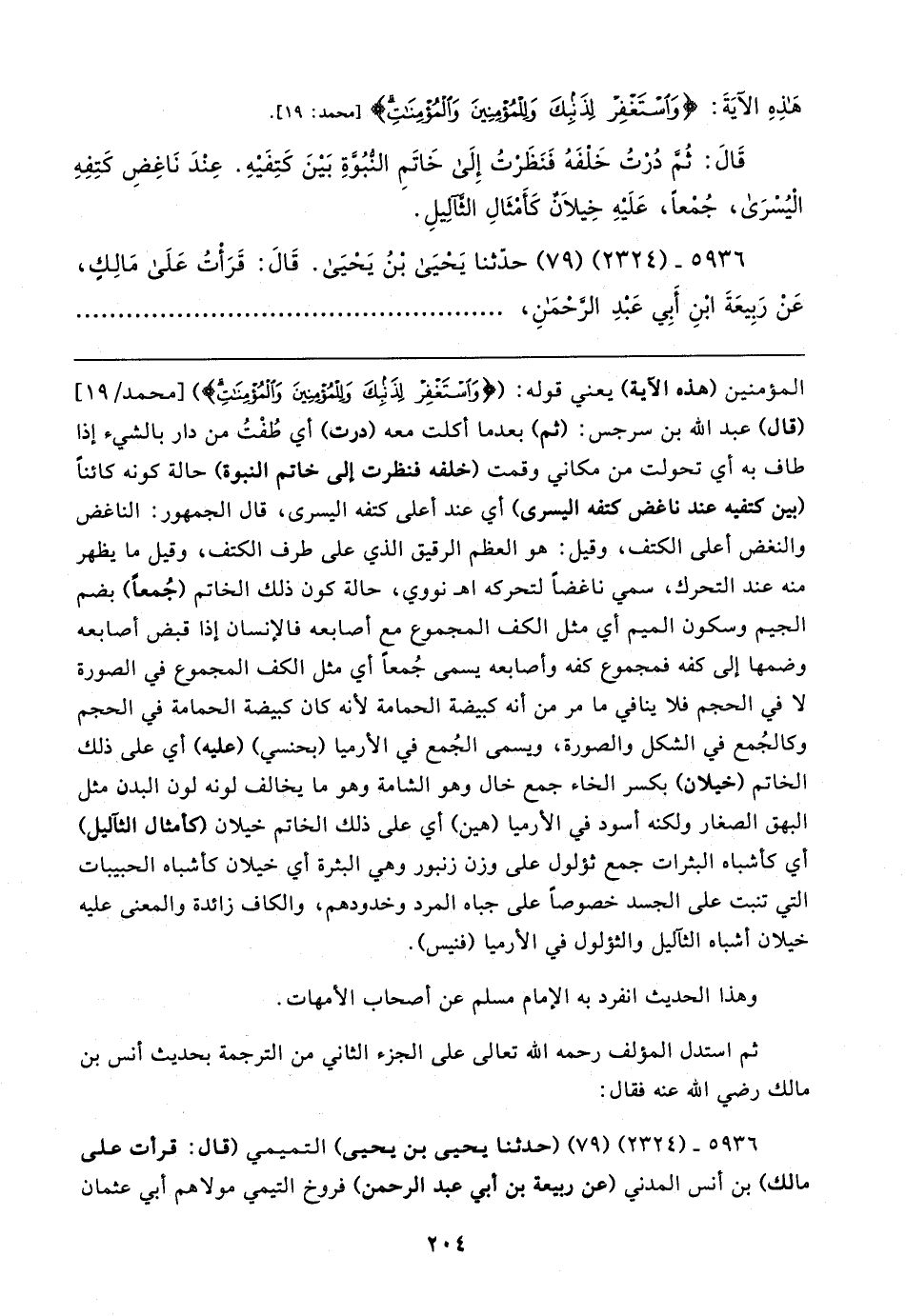 المؤمنين (هذه الآية) يعني قوله: ({وَاسْتَغْفِرْ لِذَنْبِكَ وَلِلْمُؤْمِنِينَ وَالْمُؤْمِنَاتِ}) [محمد / ١٩] (قال) عبد الله بن سرجس: (ثم) بعدما أكلت معه (درت) أي طُفْتُ من دار بالشيء إذا طاف به أي تحولت من مكاني وقمت (خلفه فنظرت إلى خاتم النبوة) حالة كونه كائنًا (بين كتفيه عند ناغض كتفه اليسرى) أي عند أعلى كتفه اليسرى، قال الجمهور: الناغض والنغض أعلى الكتف، وقيل: هو العظم الرقيق الذي على طرف الكتف، وقيل ما يظهر منه عند التحرك، سمي ناغضًا لتحركه اهـ نووي، حالة كون ذلك الخاتم (جُمعًا) بضم الجيم وسكون الميم أي مثل الكف المجموع مع أصابعه فالإنسان إذا قبض أصابعه وضمها إلى كفه فمجموع كفه وأصابعه يسمى جُمعًا أي مثل الكف المجموع في الصورة لا في الحجم فلا ينافي ما مر من أنه كبيضة الحمامة لأنه كان كبيضة الحمامة في الحجم وكالجُمع في الشكل والصورة، ويسمى الجُمع في الأرميا (بحنسي) (عليه) أي على ذلك الخاتم (خيلان) بكسر الخاء جمع خال وهو الشامة وهو ما يخالف لونه لون البدن مثل البهق الصغار ولكنه أسود في الأرميا (هين) أي على ذلك الخاتم خيلان (كأمثال الثآليل) أي كأشباه البثرات جمع ثؤلول على وزن زنبور وهي البثرة أي خيلان كأشباه الحبيبات التي تنبت على الجسد خصوصًا على جباه المرد وخدودهم، والكاف زائدة والمعنى عليه خيلان أشباه الثآليل والثؤلول في الأرميا (فنيس).
