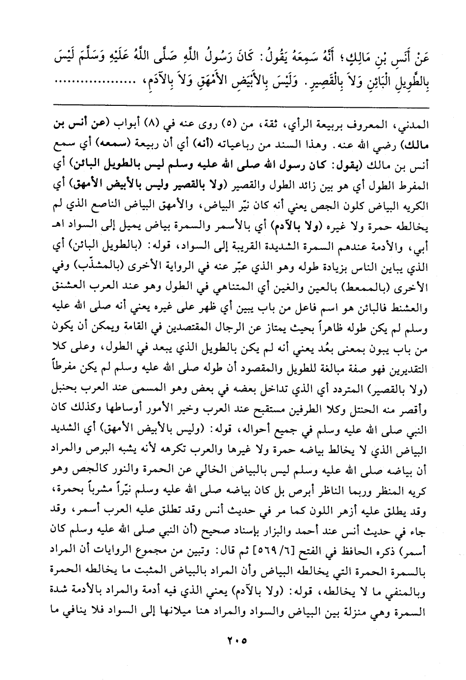 المدني، المعروف بربيعة الرأي، ثقة، من (٥) روى عنه في (٨) أبواب (عن أنس بن مالك) رضي الله عنه. وهذا السند من رباعياته (أنه) أي أن ربيعة (سمعه) أي سمع أنس بن مالك (يقول: كان رسول الله صلى الله عليه وسلم ليس بالطويل البائن) أي المفرط الطول أي هو بين زائد الطول والقصير (ولا بالقصير وليس بالأبيض الأمهق) أي الكريه البياض كلون الجص يعني أنه كان نيّر البياض، والأمهق البياض الناصع الذي لم يخالطه حمرة ولا غيره (ولا بالآدم) أي بالأسمر والسمرة بياض يميل إلى السواد اهـ أبي، والأدمة عندهم السمرة الشديدة القريبة إلى السواد، قوله: (بالطويل البائن) أي الذي يباين الناس بزيادة طوله وهو الذي عبّر عنه في الرواية الأخرى (بالمشذّب) وفي الأخرى (بالممعط) بالعين والغين أي المتناهي في الطول وهو عند العرب العشنق والعشنط فالبائن هو اسم فاعل من باب يبين أي ظهر على غيره يعني أنه صلى الله عليه وسلم لم يكن طوله ظاهرًا بحيث يمتاز عن الرجال المقتصدين في القامة ويمكن أن يكون من باب يبون بمعنى بعُد يعني أنه لم يكن بالطويل الذي يبعد في الطول، وعلى كلا التقديرين فهو صفة مبالغة للطويل والمقصود أن طوله صلى الله عليه وسلم لم يكن مفرطًا (ولا بالقصير) المتردد أي الذي تداخل بعضه في بعض وهو المسمى عند العرب بحنبل وأقصر منه الحنتل وكلا الطرفين مستقبح عند العرب وخير الأمور أوساطها وكذلك كان النبي صلى الله عليه وسلم في جميع أحواله، قوله: (وليس بالأبيض الأمهق) أي الشديد البياض الذي لا يخالط بياضه حمرة ولا غيرها والعرب تكرهه لأنه يشبه البرص والمراد أن بياضه صلى الله عليه وسلم ليس بالبياض الخالي عن الحمرة والنور كالجص وهو كريه المنظر وربما الناظر أبرص بل كان بياضه صلى الله عليه وسلم نيّرًا مشربًا بحمرة، وقد يطلق عليه أزهر اللون كما مر في حديث أنس وقد تطلق عليه العرب أسمر، وقد جاء في حديث أنس عند أحمد والبزار بإسناد صحيح (أن النبي صلى الله عليه وسلم كان أسمر) ذكره الحافظ في الفتح [٦/ ٥٦٩] ثم قال: وتبين من مجموع الروايات أن المراد بالسمرة الحمرة التي يخالطه البياض وأن المراد بالبياض المثبت ما يخالطه الحمرة وبالمنفي ما لا يخالطه، قوله: (ولا بالآدم) يعني الذي فيه أدمة والمراد بالأدمة شدة السمرة وهي منزلة بين البياض والسواد والمراد هنا ميلانها إلى السواد فلا ينافي ما