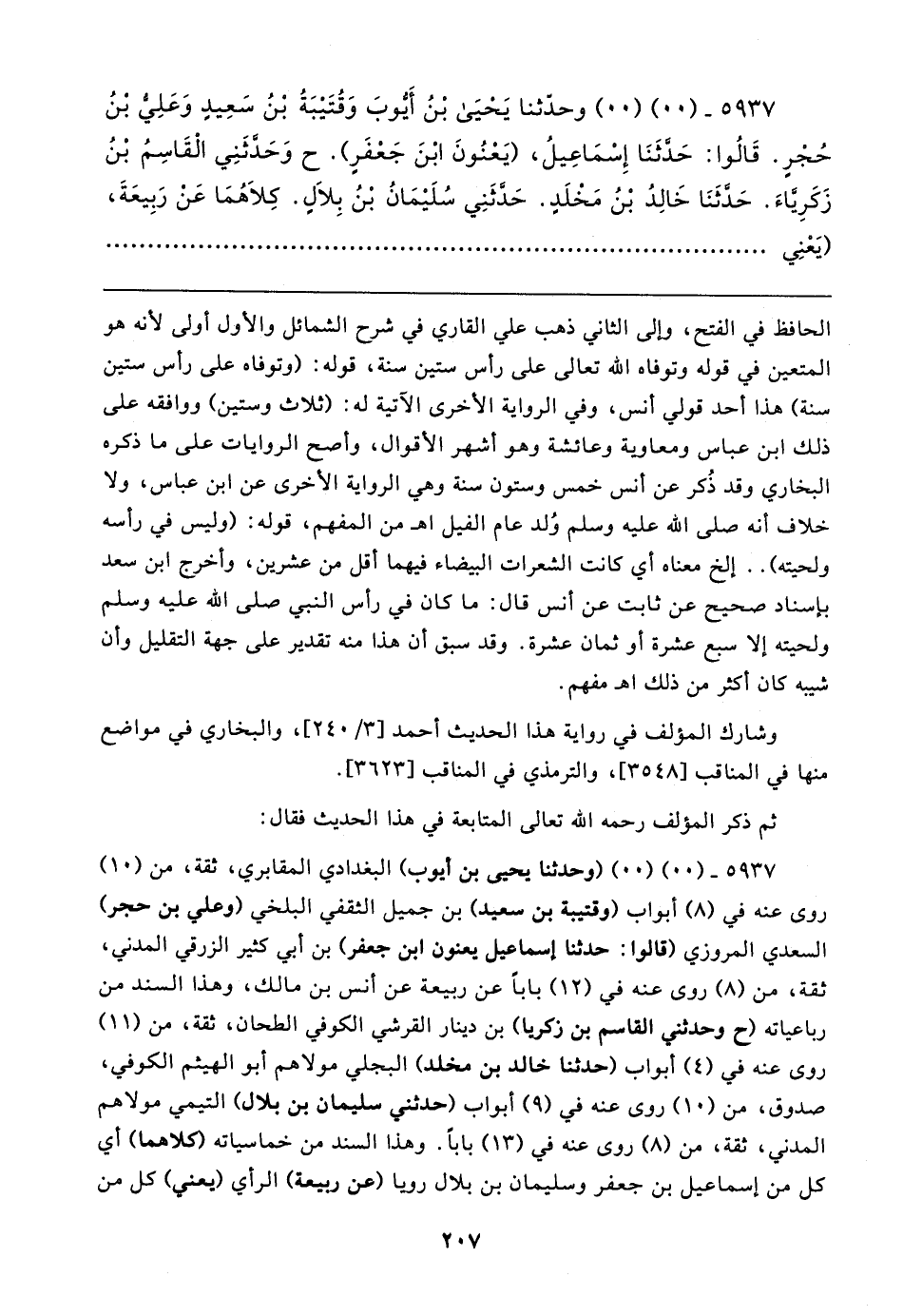 ٥٩٣٧ - (٠٠) (٠٠) (وحدثنا يحيى بن أيوب) البغدادي المقابري، ثقة، من (١٠) روى عنه في (٨) أبواب (وقتيبة بن سعيد) بن جميل الثقفي البلخي (وعلي بن حجر) السعدي المروزي (قالوا: حدثنا إسماعيل يعنون ابن جعفر) بن أبي كثير الزرقي المدني، ثقة، من (٨) روى عنه في (١٢) بابا عن ربيعة عن أنس بن مالك، وهذا السند من رباعياته (ح وحدثني القاسم بن زكريا) بن دينار القرشي الكوفي الطحان، ثقة، من (١١) روى عنه في (٤) أبواب (حدثنا خالد بن مخلد) البجلي مولاهم أبو الهيثم الكوفي، صدوق، من (١٠) روى عنه في (٩) أبواب (حدثني سليمان بن بلال) التيمي مولاهم المدني، ثقة، من (٨) روى عنه في (١٣) بابا. وهذا السند من خماسياته (كلاهما) أي كل من إسماعيل بن جعفر وسليمان بن بلال رويا (عن ربيعة) الرأي (يعني) كل من