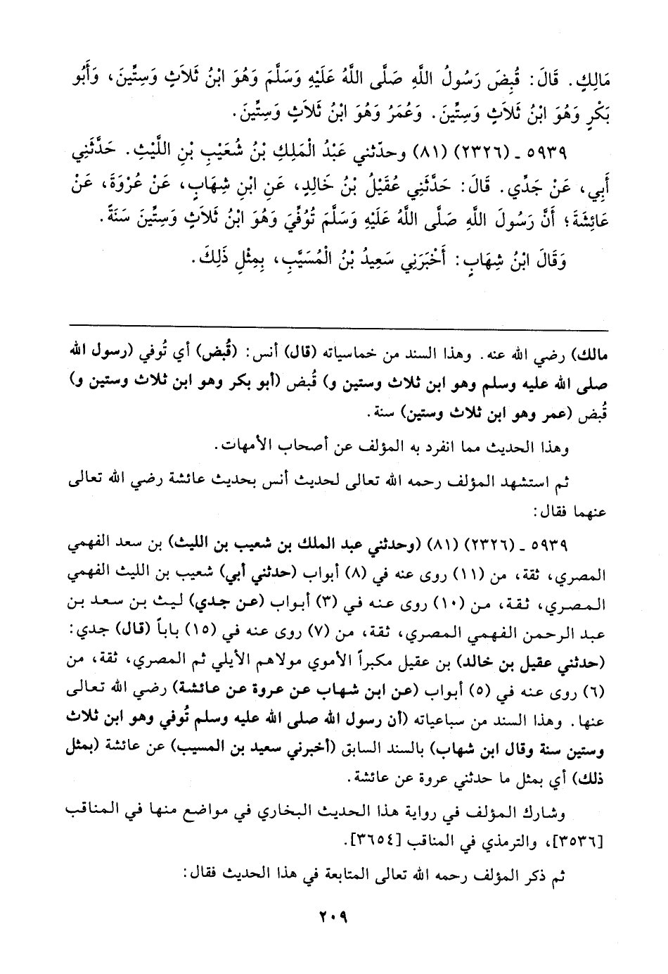 ٥٩٣٩ - (٢٣٢٦) (٨١) (وحدثني عبد الملك بن شعيب بن الليث) بن سعد الفهمي المصري، ثقة، من (١١) روى عنه في (٨) أبواب (حدثني أبي) شعيب بن الليث الفهمي المصري، ثقة، من (١٠) روى عنه في (٣) أبواب (عن جدي) ليث بن سعد بن عبد الرحمن الفهمي المصري، ثقة، من (٧) روى عنه في (١٥) بابا (قال) جدي: (حدثني عقيل بن خالد) بن عقيل مكبرًا الأموي مولاهم الأيلي ثم المصري، ثقة، من (٦) روى عنه في (٥) أبواب (عن ابن شهاب عن عروة عن عائشة) رضي الله تعالى عنها. وهذا السند من سباعياته (أن رسول الله صلى الله عليه وسلم تُوفي وهو ابن ثلاث وستين سنة وقال ابن شهاب) بالسند السابق (أخبرني سعيد بن المسيب) عن عائشة (بمثل ذلك) أي بمثل ما حدثني عروة عن عائشة.