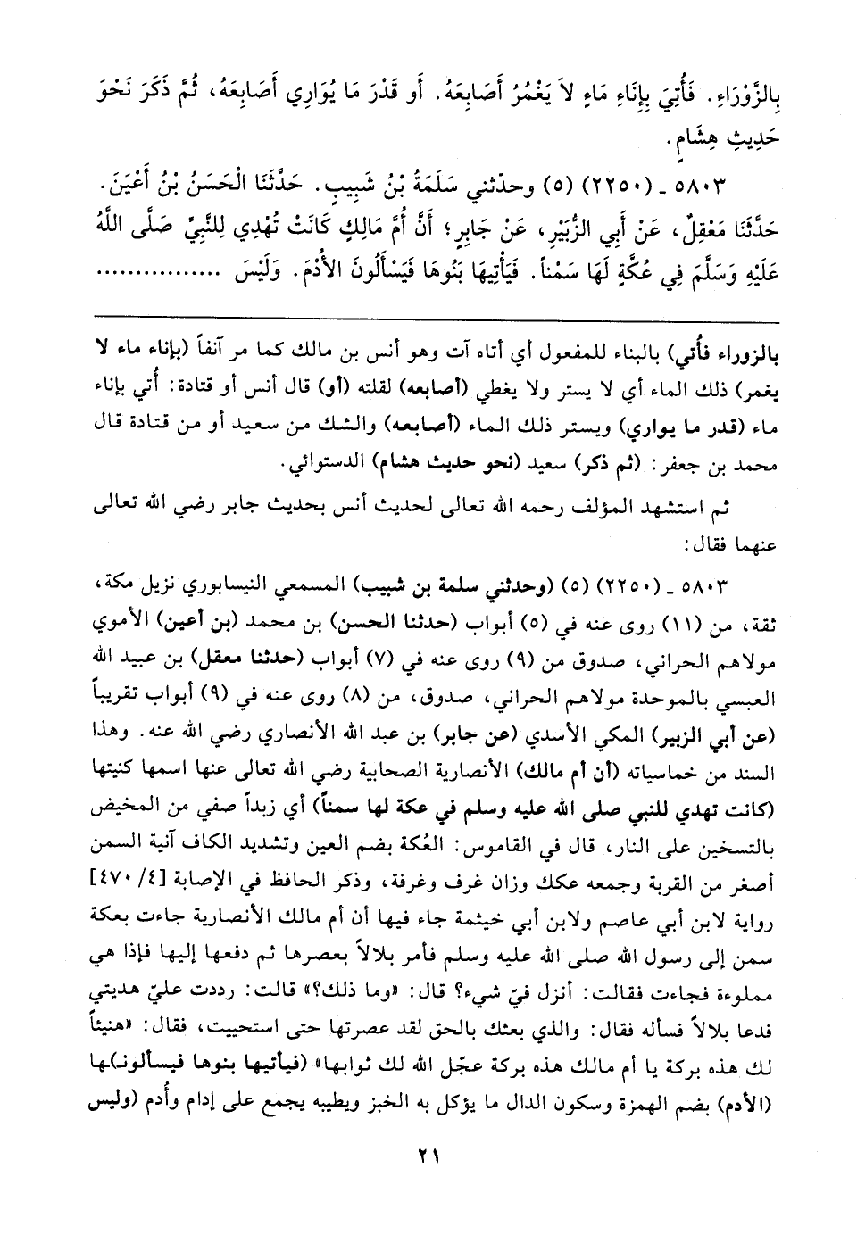 ٥٨٠٣ - (٢٢٥٠) (٥) وحدَّثني سَلَمَةُ بن شَبِيبٍ. حَدَّثَنَا الْحَسَنُ بْنُ أَعْيَنَ. حَدَّثَنَا مَعْقِلٌ، عَنْ أَبِي الزُّبَيرِ، عَن جَابِرٍ؛ أَنَّ أُمِّ مَالِكِ كَانَتْ تُهْدِي لِلنَّبِيِّ صَلَّى اللهُ عَلَيهِ وَسَلَّمَ في عُكَّةٍ لَهَا سَمْنًا. فَيَأْتِيهَا بَنُوهَا فَيَسْأَلُونَ الُأدمَ. وَلَيسَ