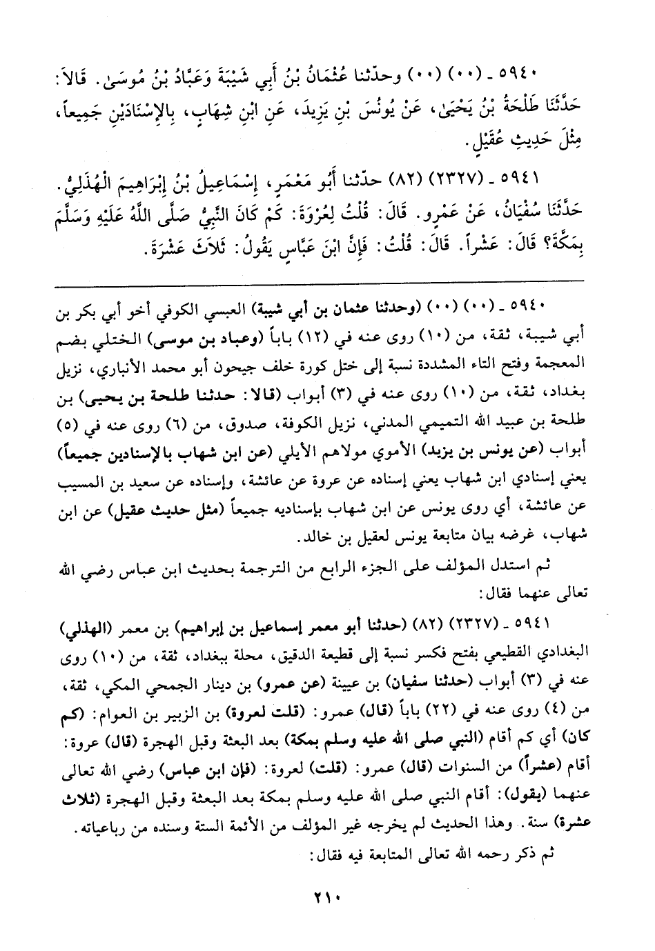 ٥٩٤٠ - (٠٠) (٠٠) (وحدثنا عثمان بن أبي شيبة) العبسي الكوفي أخو أبي بكر بن أبي شيبة، ثقة، من (١٠) روى عنه في (١٢) بابا (وعباد بن موسى) الختلي بضم المعجمة وفتح التاء المشددة نسبة إلى ختل كورة خلف جيحون أبو محمد الأنباري، نزيل بغداد، ثقة، من (١٠) روى عنه في (٣) أبواب (قالا: حدثنا طلحة بن يحيى) بن طلحة بن عبيد الله التميمي المدني، نزيل الكوفة، صدوق، من (٦) روى عنه في (٥) أبواب (عن يونس بن يزيد) الأموي مولاهم الأيلي (عن ابن شهاب بالإسنادين جميعًا) يعني إسنادي ابن شهاب يعني إسناده عن عروة عن عائشة، وإسناده عن سعيد بن المسيب عن عائشة، أي روى يونس عن ابن شهاب بإسناديه جميعًا (مثل حديث عقيل) عن ابن شهاب، غرضه بيان متابعة يونس لعقيل بن خالد.