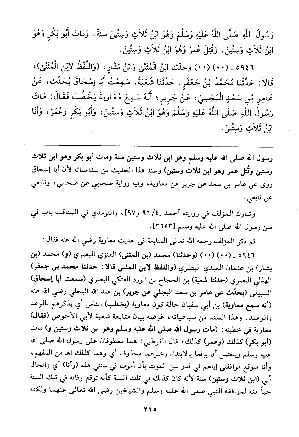 ٥٩٤٦ - (٠٠) (٠٠) وحدّثنا ابْنُ الْمُثَنَّى وَابْنُ بَشَّارٍ، (وَاللَّفْظُ لابْنِ الْمُثَنَّى)، قَالا: حَدَّثَنَا مُحَمَّدُ بْنُ جَعْفَرٍ. حَدَّثَنَا شُعْبَةُ، سَمِعْتُ أَبَا إِسْحَاقَ يُحَدِّث، عَنْ عَامِرِ بْنِ سَعْدٍ الْبَجَلِيِّ، عَنْ جَرِيرٍ؛ أَنَّهُ سَمِعَ مُعَاوَيةَ يَخطُبُ فَقَال: مَاتَ رَسُولُ اللهِ صَلَّى اللهُ عَلَيهِ وَسَلَّمَ وَهُوَ ابْنُ ثَلاثٍ وَسِتِّينَ، وَأَبُو بَكْرٍ وَعُمَرُ، وَأَنَا ابْنُ ثَلاثٍ وَسِتِّينَ