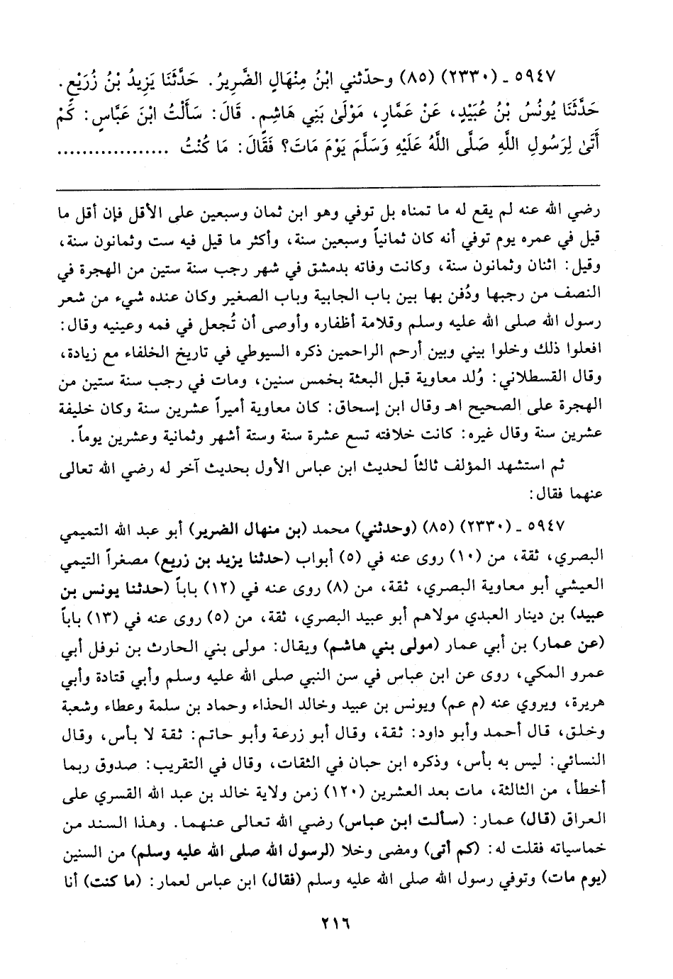 ٥٩٤٧ - (٢٣٣٠) (٨٥) وحدّثني ابْنُ مِنْهَالٍ الضَّرِيرُ. حَدَّثَنَا يَزِيدُ بْنُ زُريعٍ. حَدَّثَنَا يُونُسُ بْنُ عُبَيدٍ، عَنْ عَمَّارٍ، مَوْلَى بَنِي هَاشِمٍ. قَال: سَأَلْتُ ابْنَ عَبَّاسٍ: كَمْ أَتَى لِرَسُولِ اللهِ صَلَّى اللهُ عَلَيهِ وَسَلَّمَ يَوْمَ مَاتَ؟ فَقَال: مَا كُنْتُ
